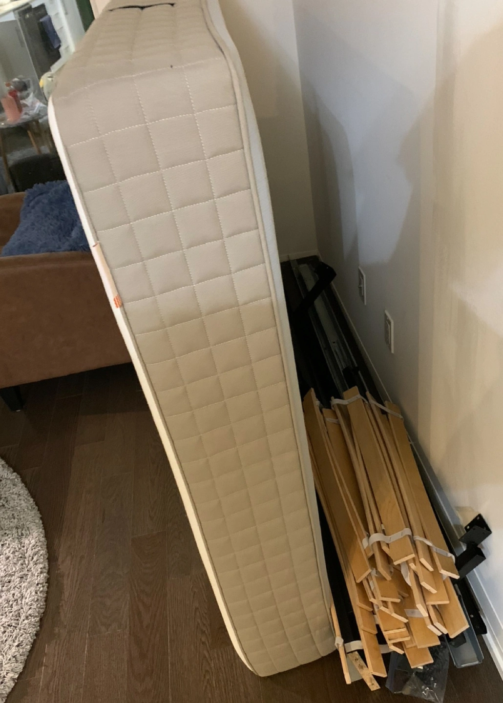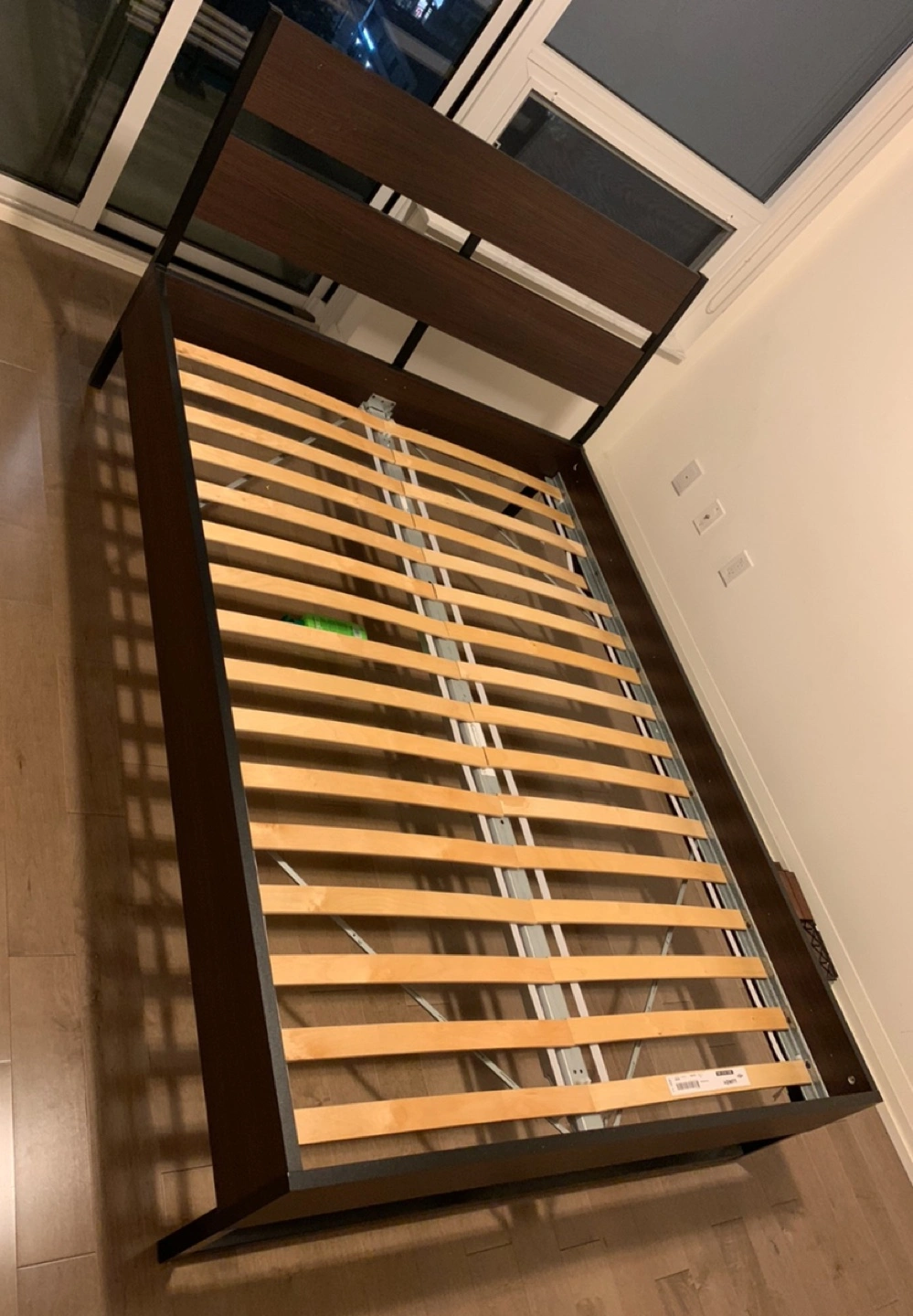 $250 or a best offer. - Very good quality - Used for 1 year - Pickup only (460 Adelaide street east) - Queen size Set of 3 ー + Bed frame https://www.ikea.com/ca/en/p/trysil-bed-frame-dark-brown-luroey-s69069799/ + Spring mattress https://www.ikea.com/ca/en/p/haugesund-spring-mattress-medium-firm-dark-beige-70307308/ + Bed base https://www.ikea.com/ca/en/p/luroey-slatted-bed-base-00160215/