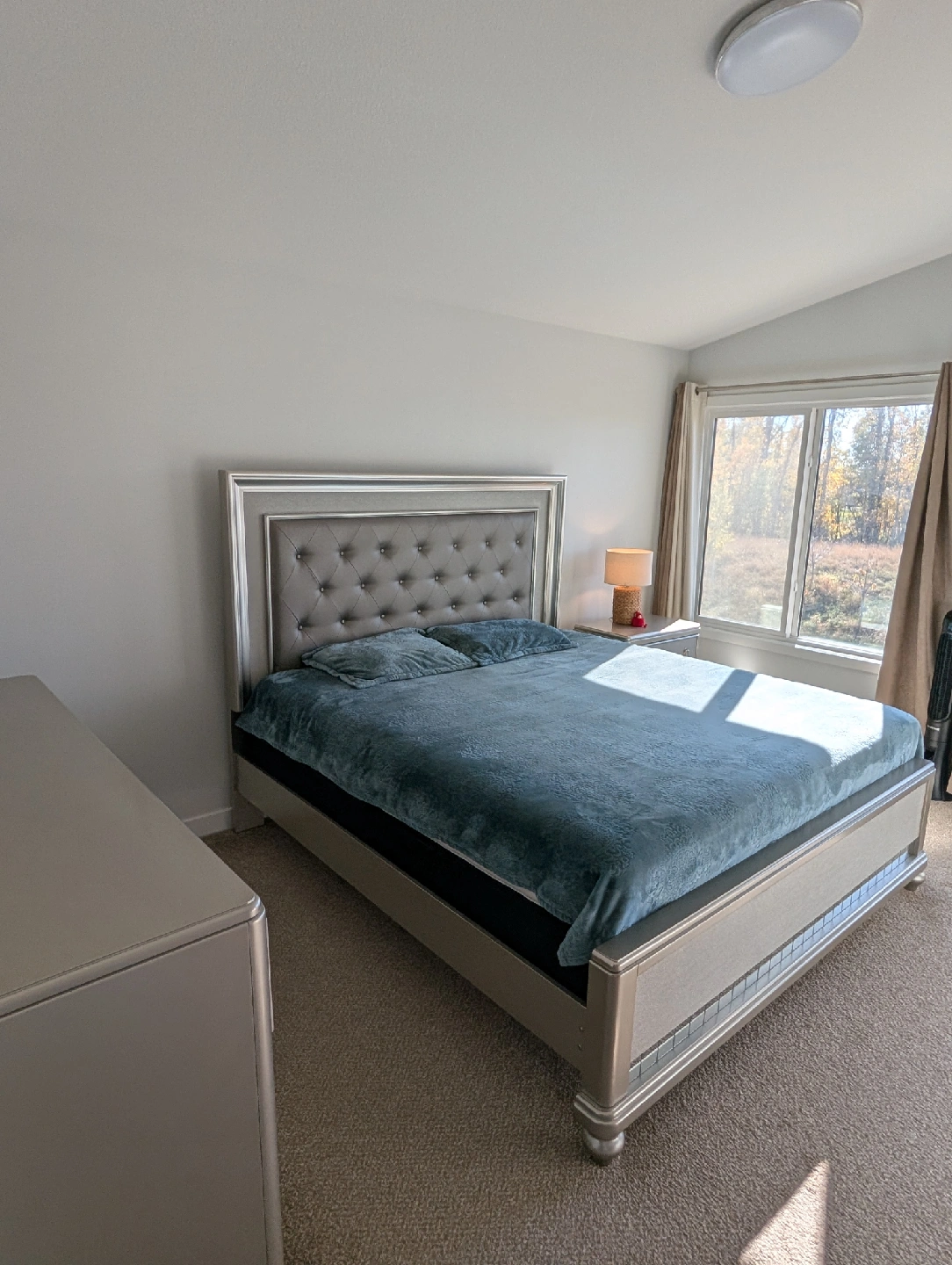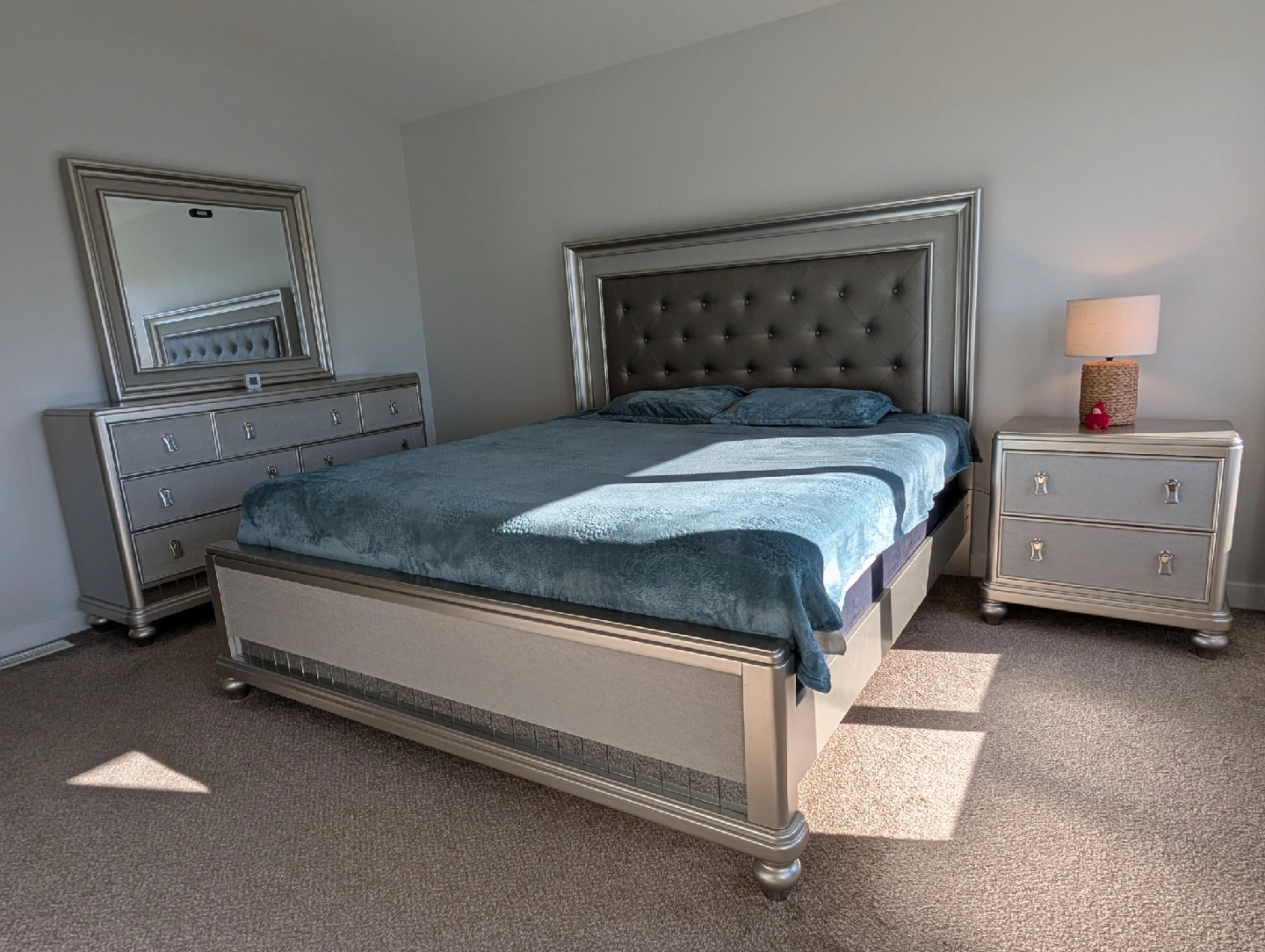 73Selling a complete bedroom set! Includes a bed frame with a tufted headboard, a dresser with a mirror, and a nightstand. The set features a silver finish and is in great condition.