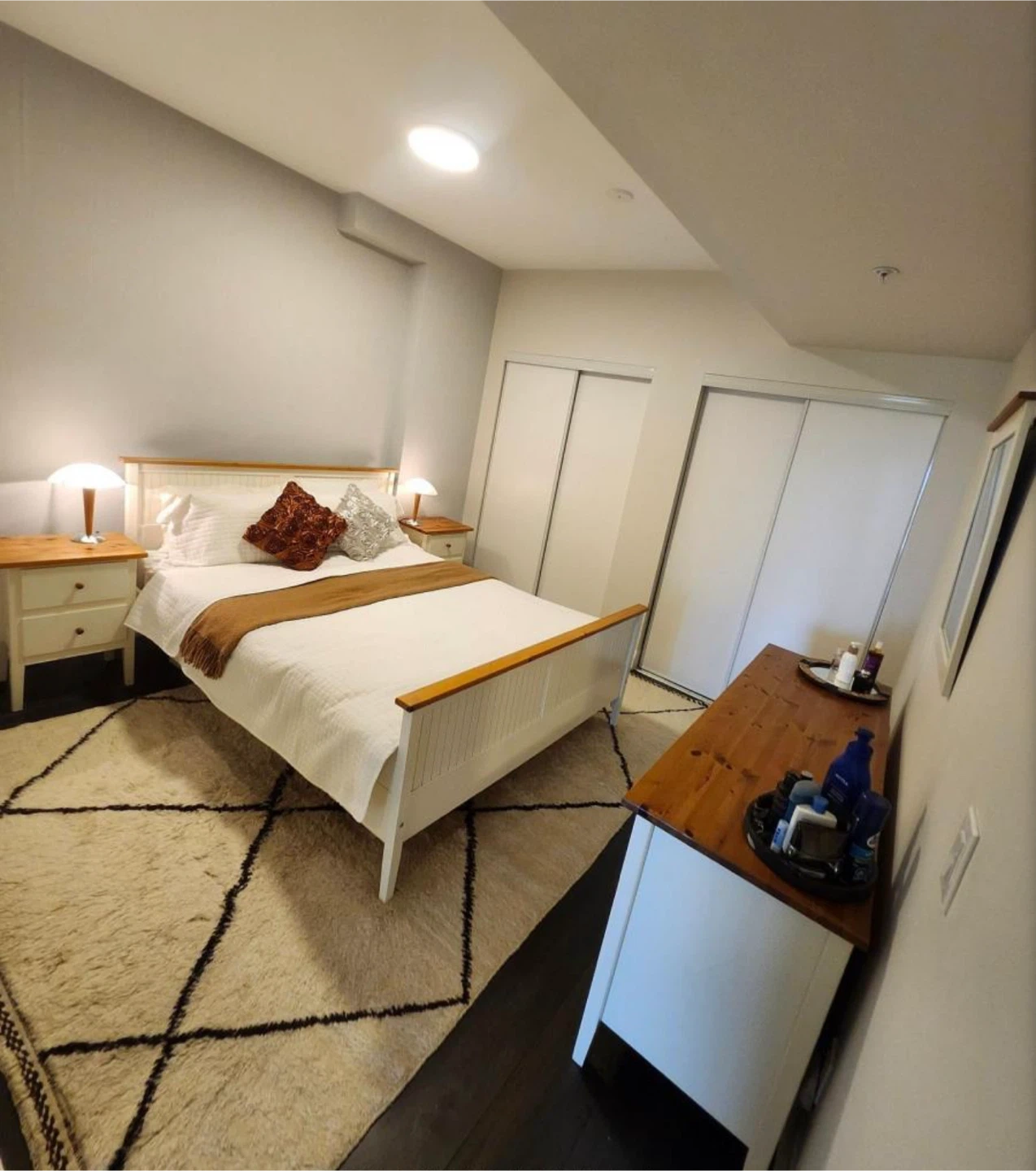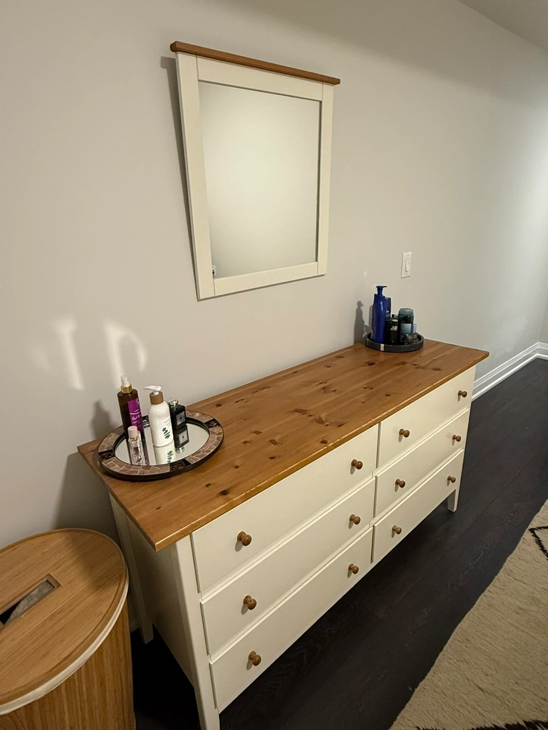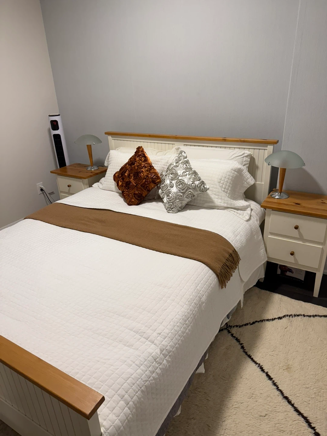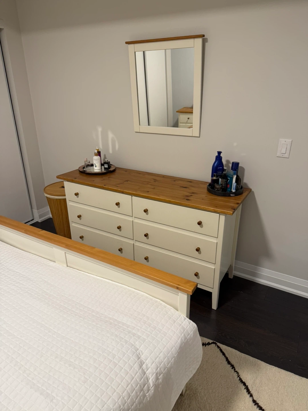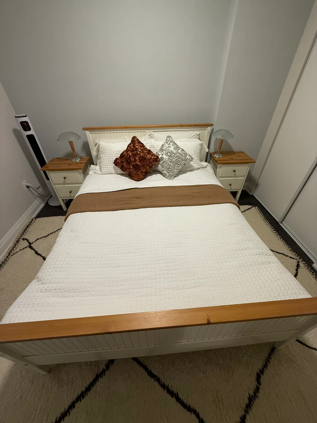 15Bedroom set including a queen size bed frame, dresser with mirror, and two nightstands. The furniture features a classic design with a light-coloured frame and a natural wood finish on the top surfaces. It's in great condition and ready to enhance your bedroom! Pick up only with cash $375 payment. Mattress not included but will consider selling at the right price. Location is near Queen and Goreway in Brampton. If you're reading this ad means it's available. Thanks.