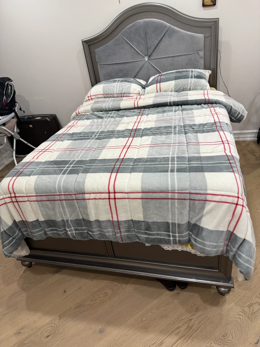 10Bedroom set for sale! Includes a bed frame with a stylish headboard and a matching dresser. The set has a modern design and is in good condition. Perfect for updating your bedroom decor!