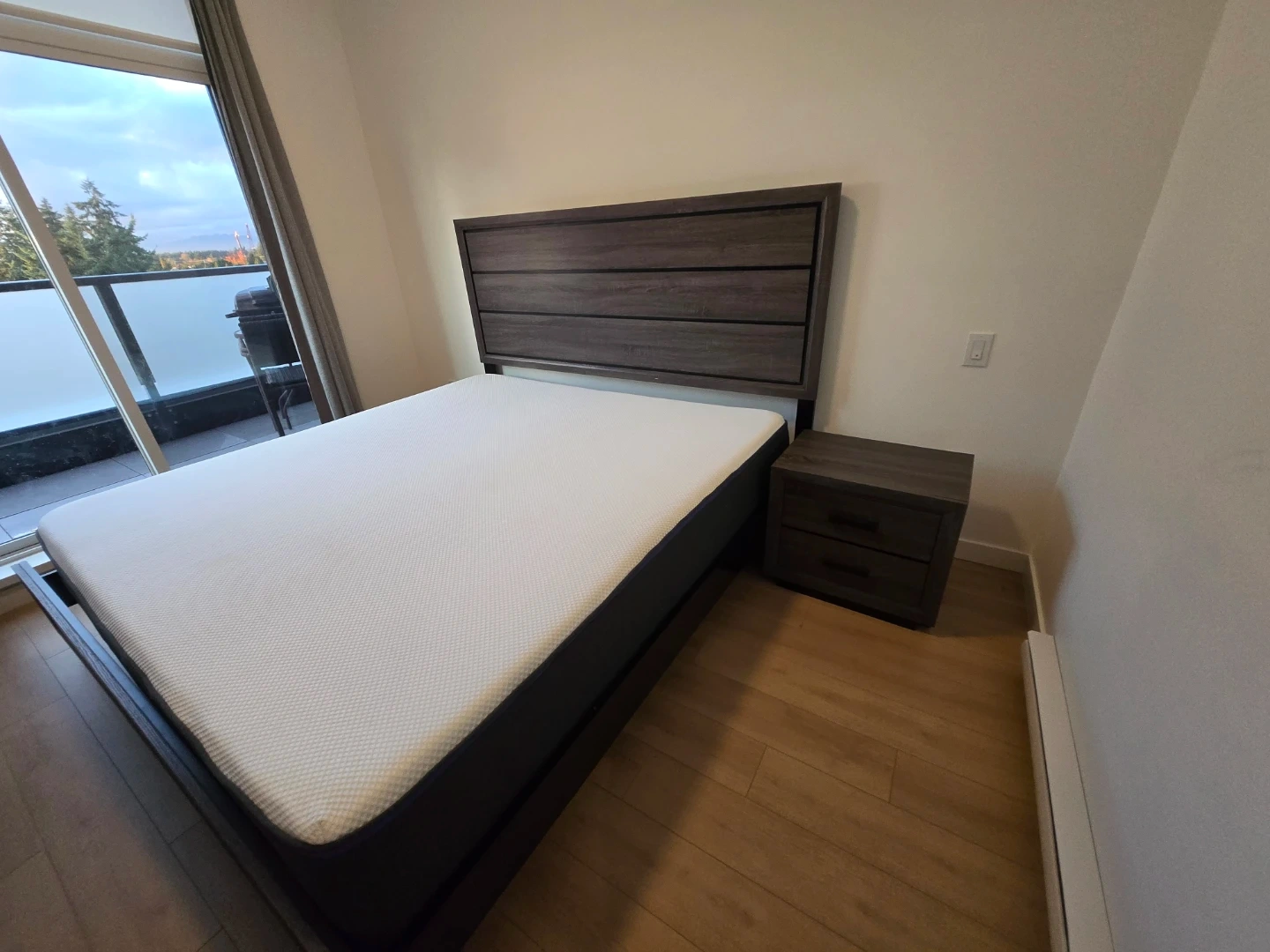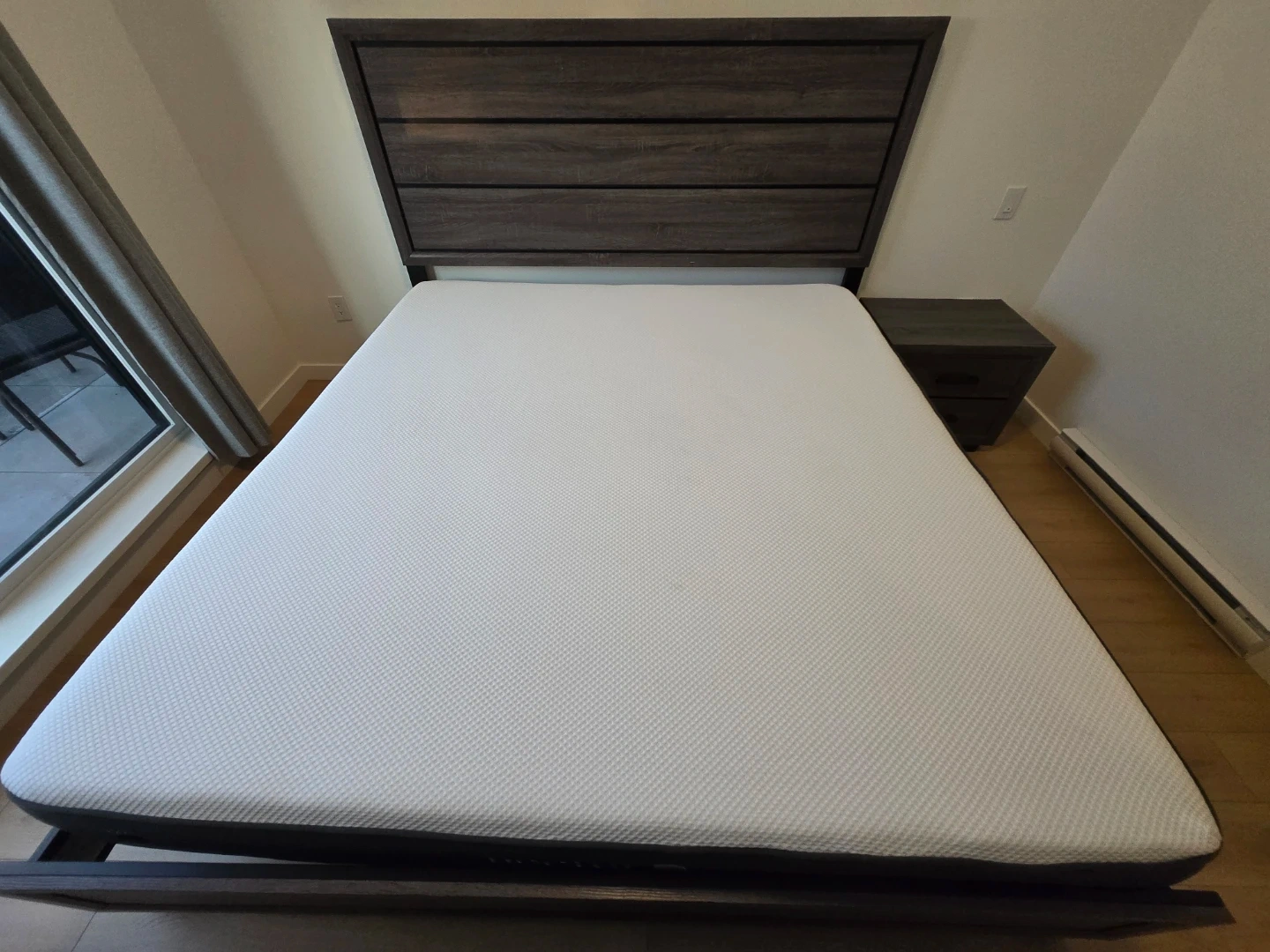 10Bedroom set available, including a bed frame with headboard, a nightstand, and a dresser. All pieces are in a matching dark wood finish. Great for furnishing a bedroom quickly and easily!