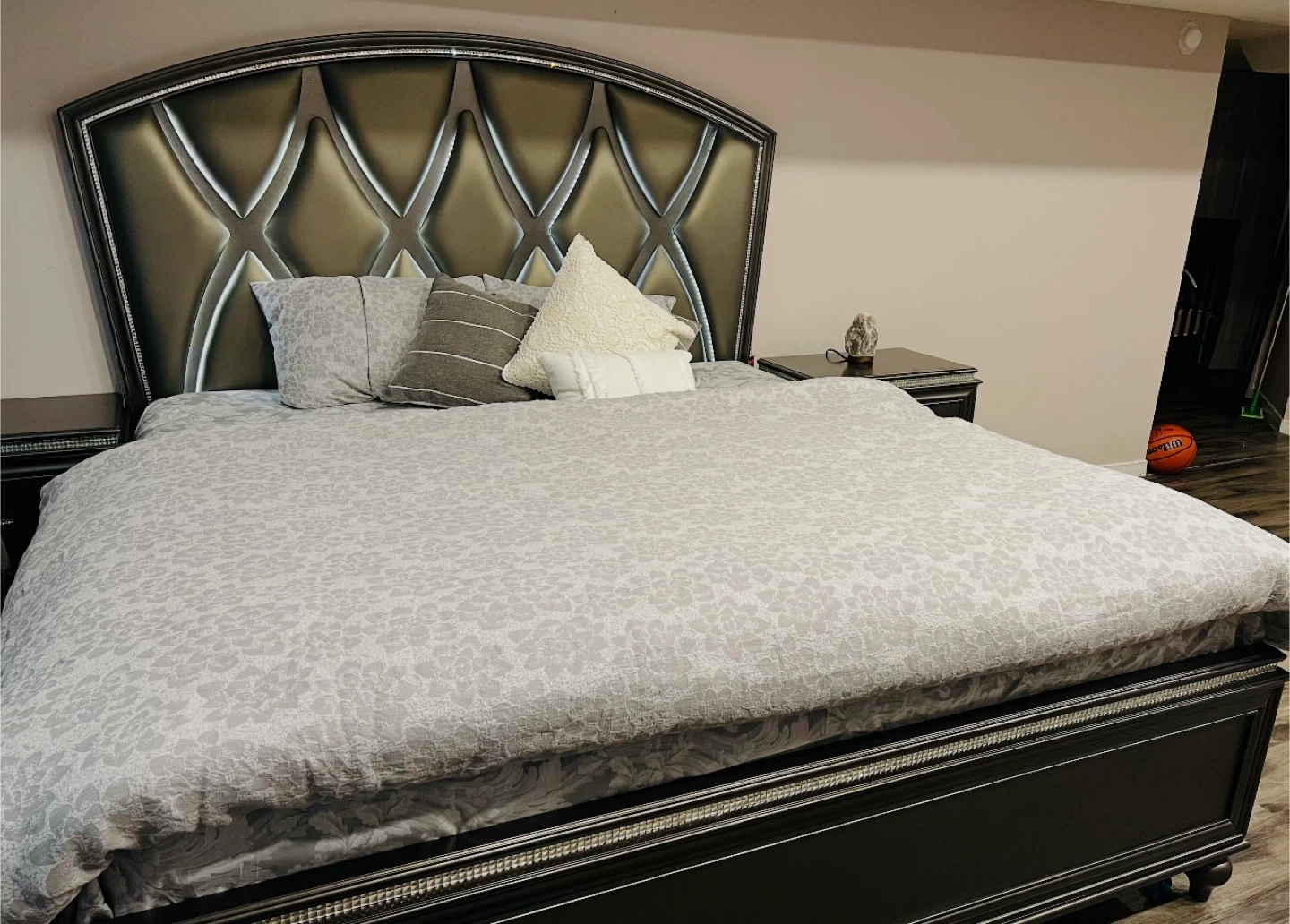 Selling a bedroom set including a dresser and bed frame. The dresser features five drawers and a decorative trim. The bed frame has a padded headboard with a diamond pattern.