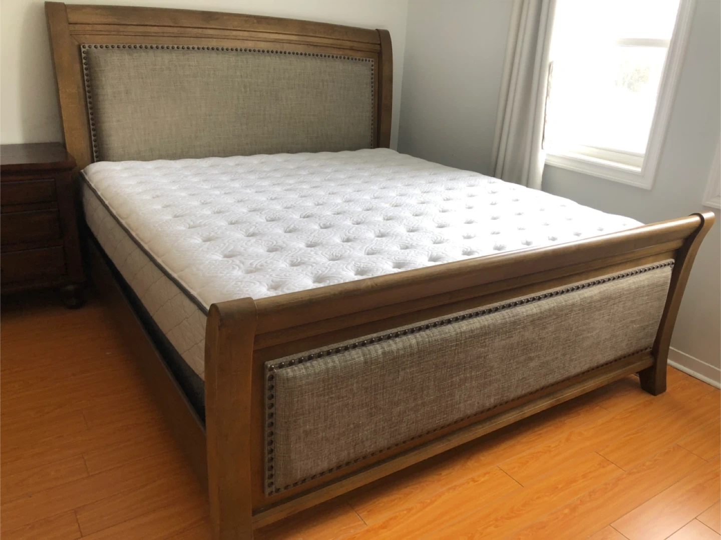 33Selling a bedroom set including a dresser with a mirror, a chest of drawers, and a king size bed frame and king mattress. The set is in good condition and would be a great addition to any bedroom. The wood finish is a warm tone, and the furniture has a classic design.