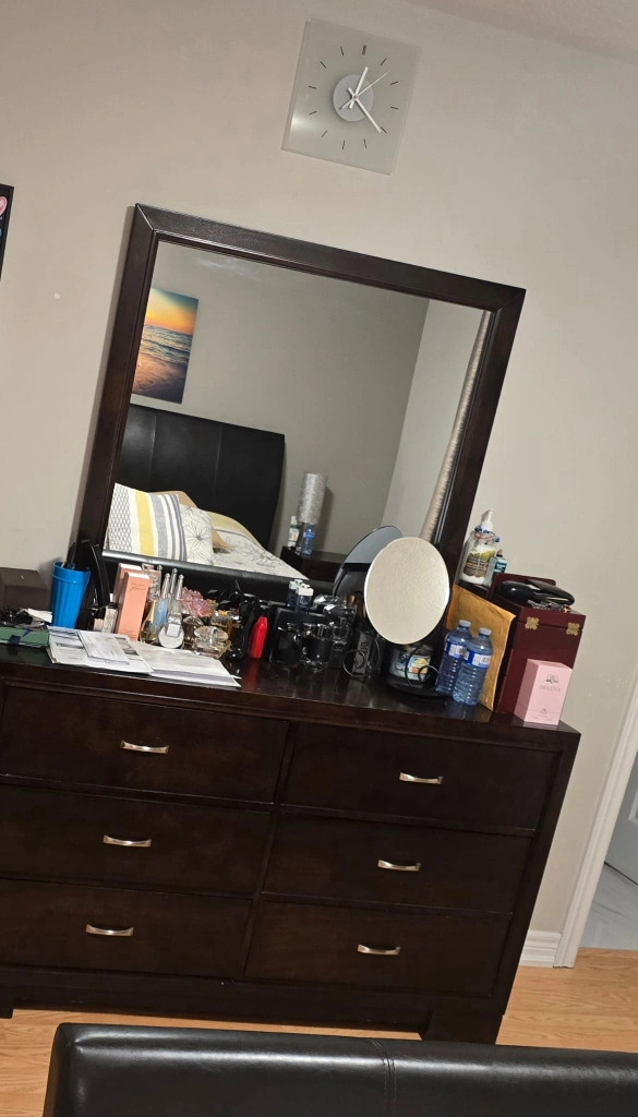 60Selling a bedroom set including a dresser with a mirror, a nightstand, and a bed frame. The furniture is a dark brown colour. It's in great condition and would be a lovely addition to any bedroom