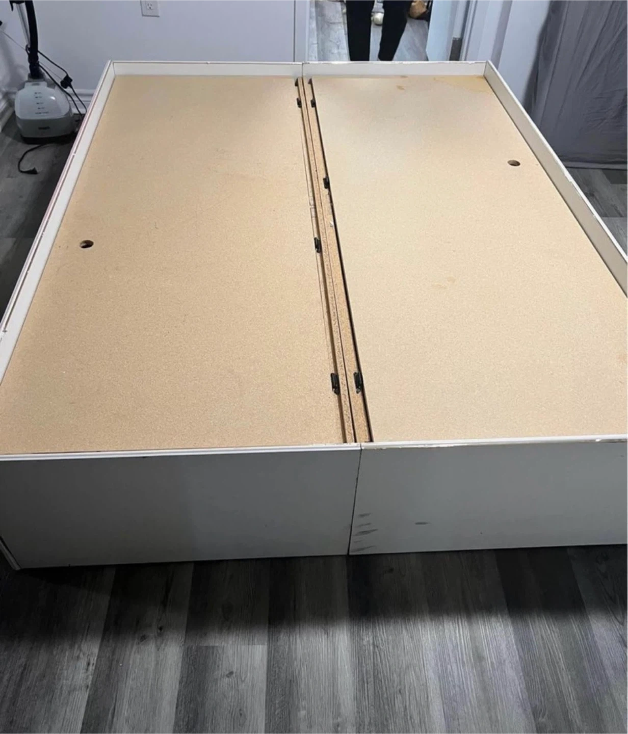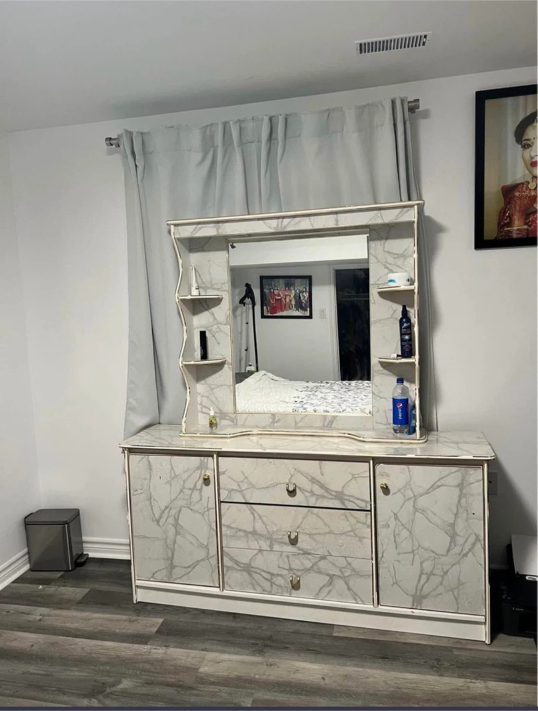 10For sale: Bedroom set featuring a bed frame, dresser with mirror, and nightstand. Finished in a stylish white and grey marble pattern, the set is in good condition and ready to find a new home!