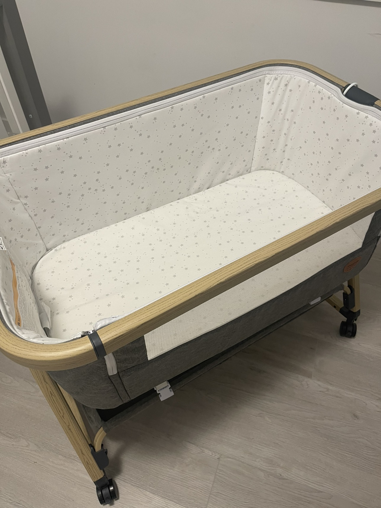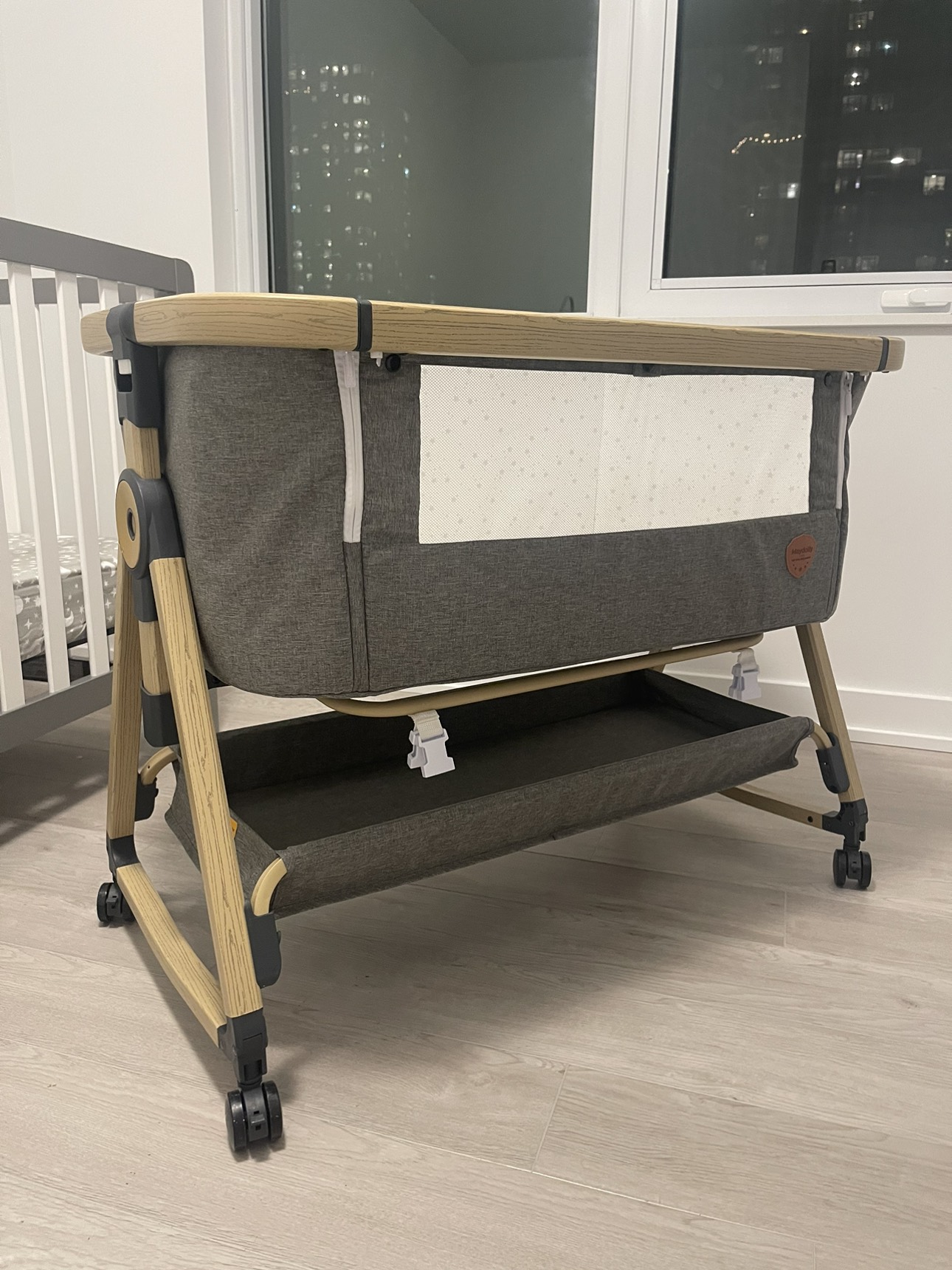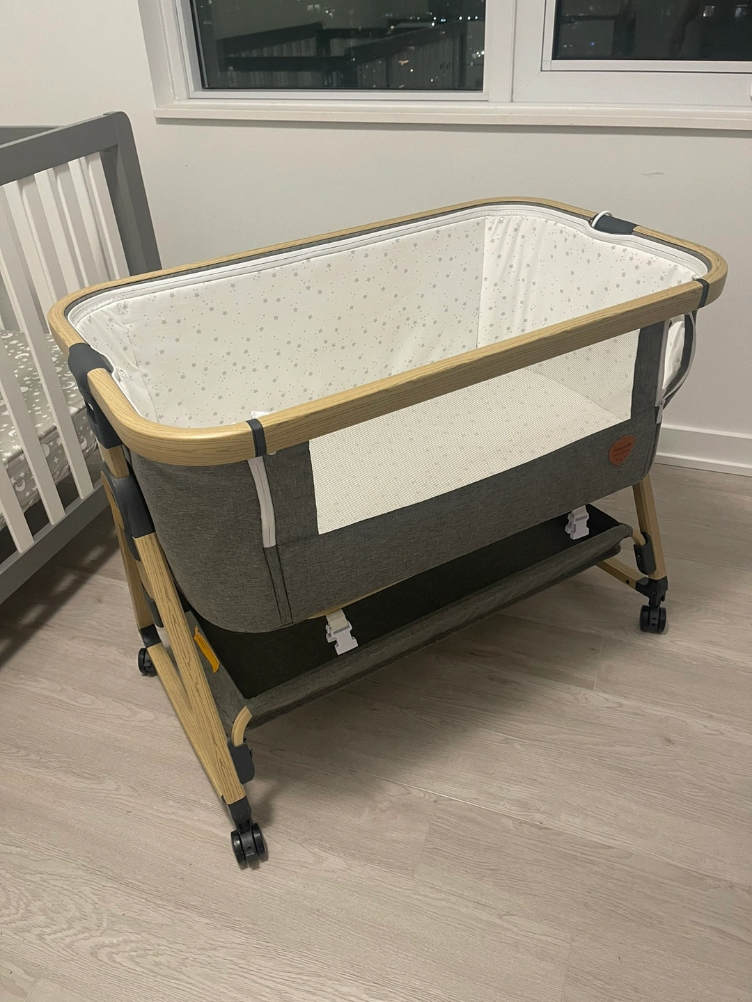 28Versatile bedside bassinet. Our little one outgrew this. Gently used for 6 months and kept clean. Locking wheels, height adjustable, nice breathable material with a mesh cover. Can be easily folded and restored in its bag. Great for newborn baby. New is +300 dollars. I’ll include 4 high quality waterproof bassinet mattress covers worth $100 for free.