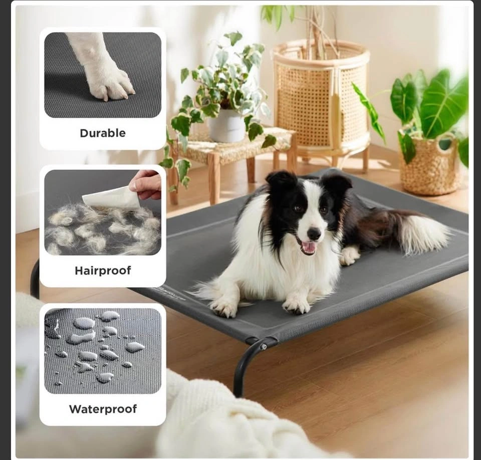 60Some scratched and dust) ELEVATED COMFORT: Bedsure Elevated Dog Bed (8" Off the ground) lifts your doggy pal off wet, muddy grass to keep him clean and cool, especially on rainy or hot days - Durable Teslin (recyclable and non-toxic) mesh allows air to flow right through the fabric and he/she will be feeling the breeze in summer - Can ease the stress/pain on your pet s joints. DURABLE DESIGN: Well-built frame helps the pet bed stable and safely elevated for your dog to rest easy on - Durable sleeping surface supports your pets comfortably and resists rips from claws - Equipped with skid-resistant feet, our elevated dog bed protects your floors from scratches and keeps the bed from sliding when your dog jumps on or off. DIMENSION & CARE: Medium Raised Dog Cot: 105L x 65W x 20H cm (Frame), 89L x 64W cm (Mesh), up to 65 lbs (30 kg)