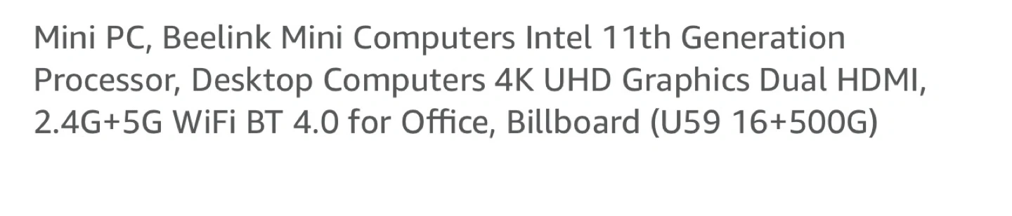 75Selling a Beelink U59 Mini PC. It's in excellent condition and comes with the box! It's easy to carry, measuring 4.88 x 4.44 x 1.65 inches and weighing only 11.35 ounces. It has multiple interfaces including 4 USB3.0 ports, 2 HDMI ports, 1 DC Jack port, 2 RJ45 1000M ports, 1 Audio Jack (HP&MIC) port, and 1 Type-C port