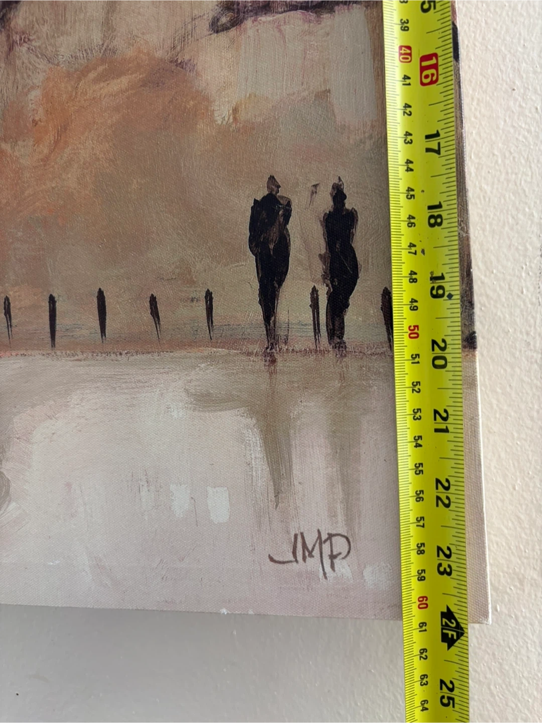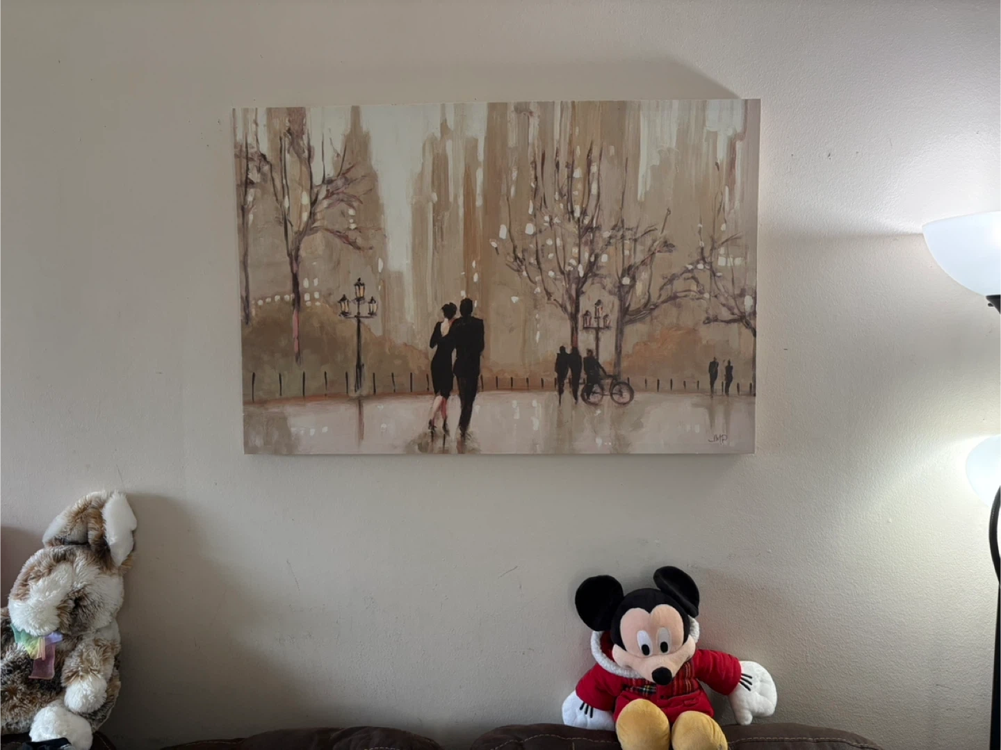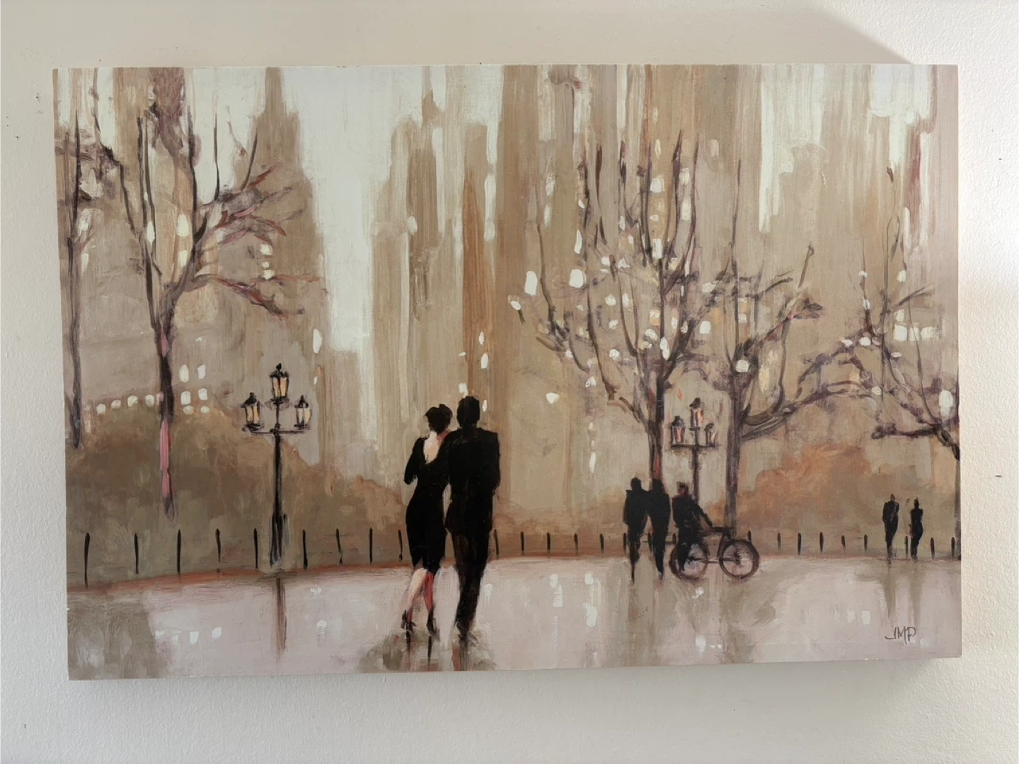 This artwork features a beautiful scene of a couple walking in a city. It's in good condition and adds a touch of elegance to any room.
