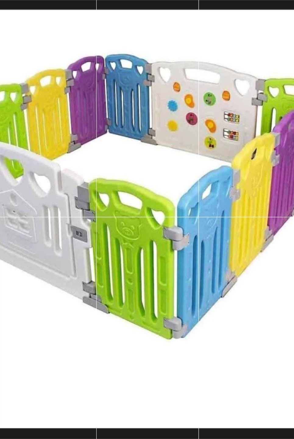 This playpen is made of sturdy plastic panels in various bright colours. It's easy to assemble and provides a safe space for little ones. Includes decorative stickers on some panels.