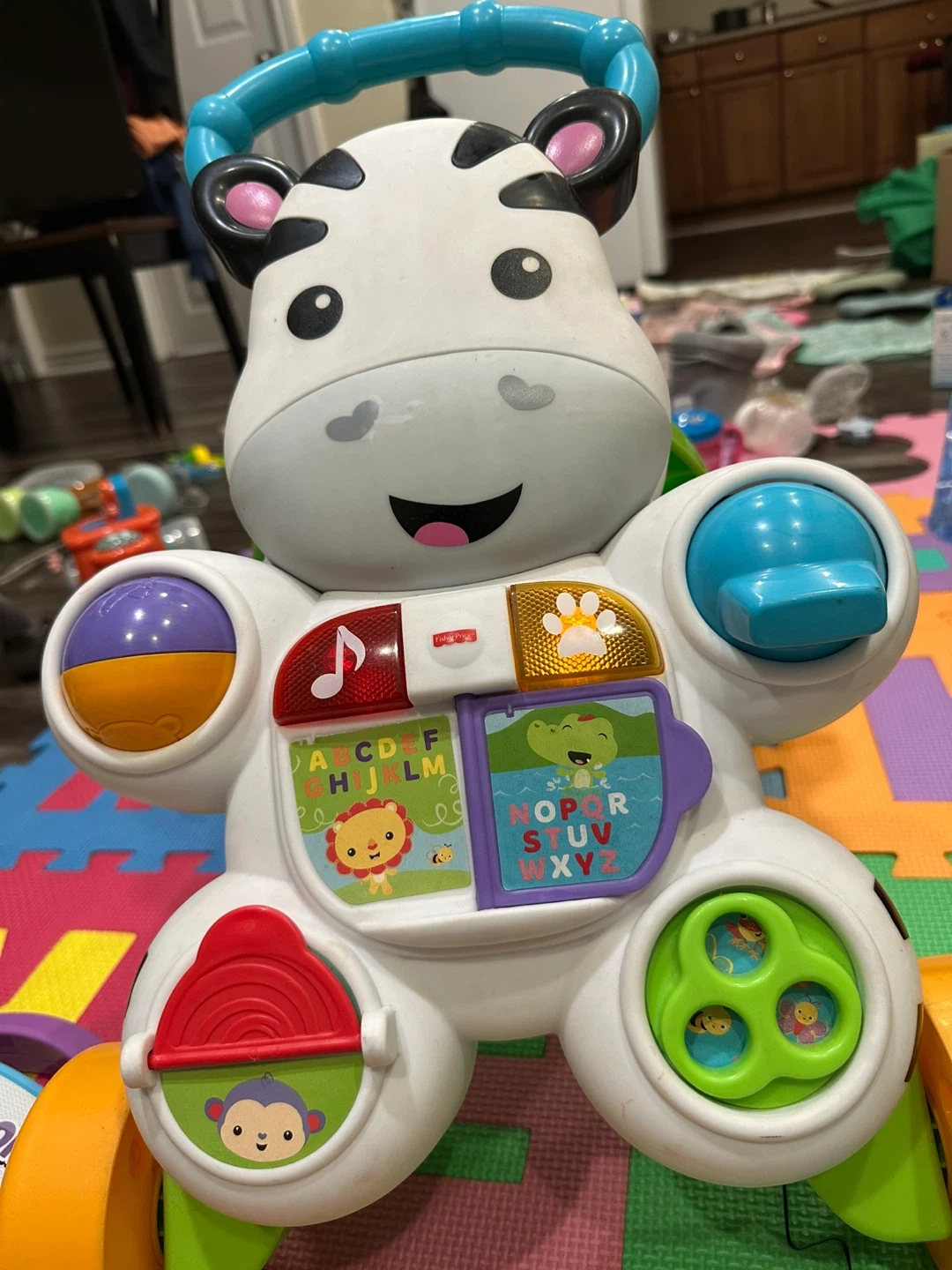 This Fisher-Price zebra walker helps little ones learn to walk and play. It has colourful buttons and interactive activities. It's designed for babies and toddlers learning to stand and take their first steps.