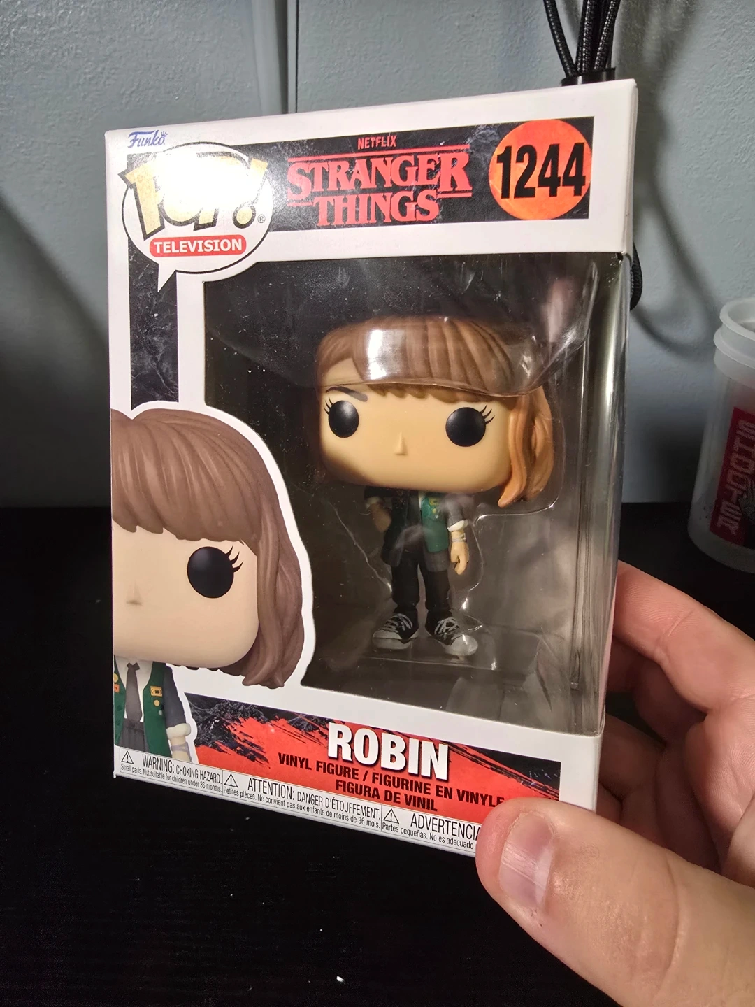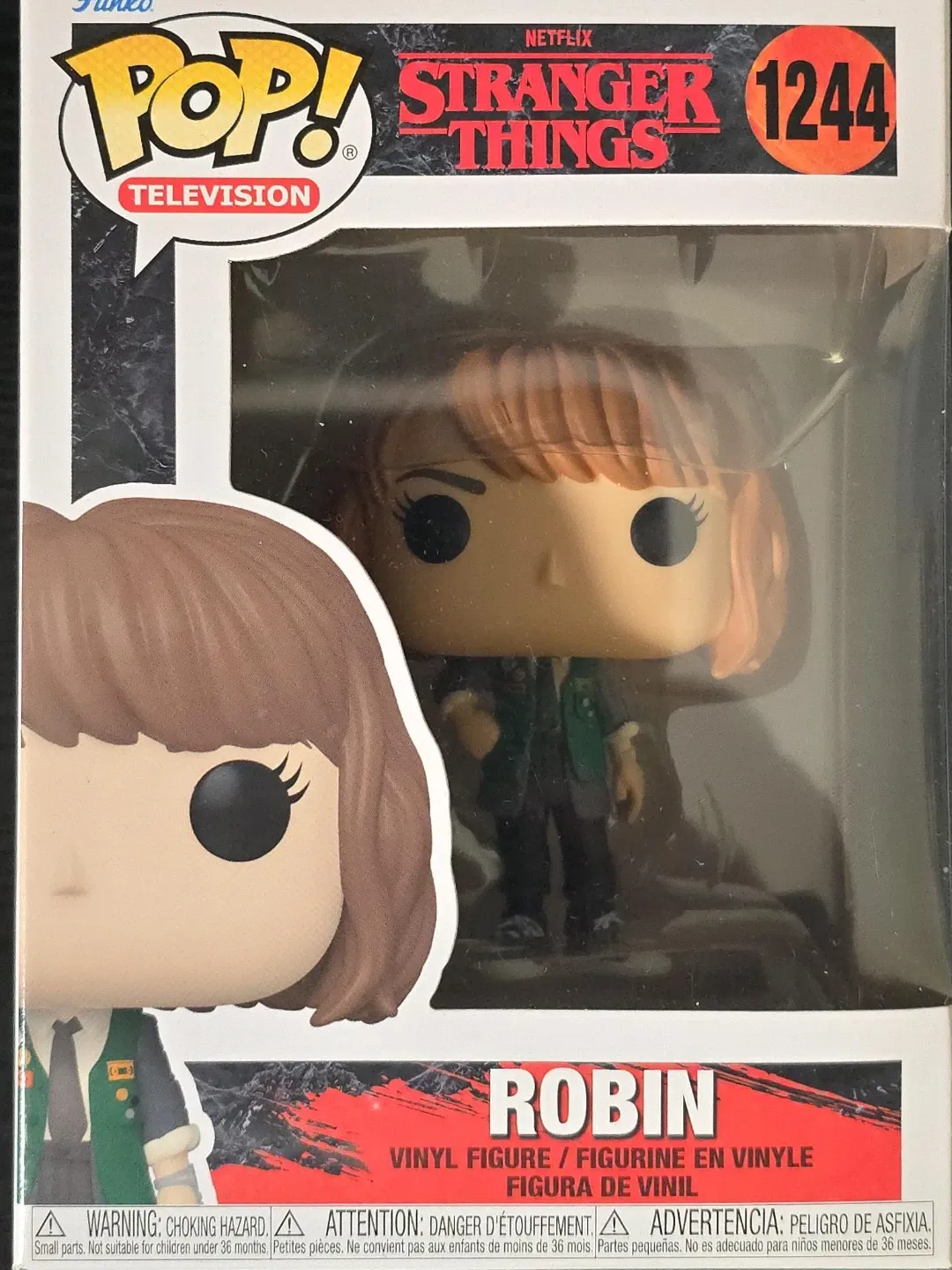 This is a Funko Pop! vinyl figure of Robin from Stranger Things. It's figure number 1244 in the collection. The item comes in its original box.