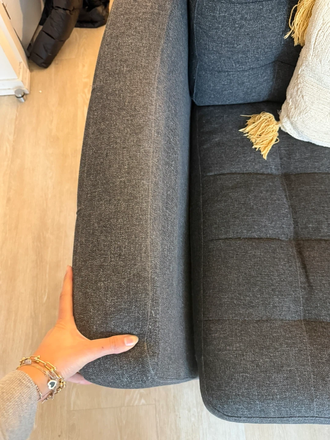 This is a comfy grey two-seater sofa. It comes with one decorative lumbar pillow featuring a geometric design. The sofa has tufted seat cushions and wooden legs. The arm of the couch is a bit wiggly and needs to be adjusted, but other than that couch is in good condition.