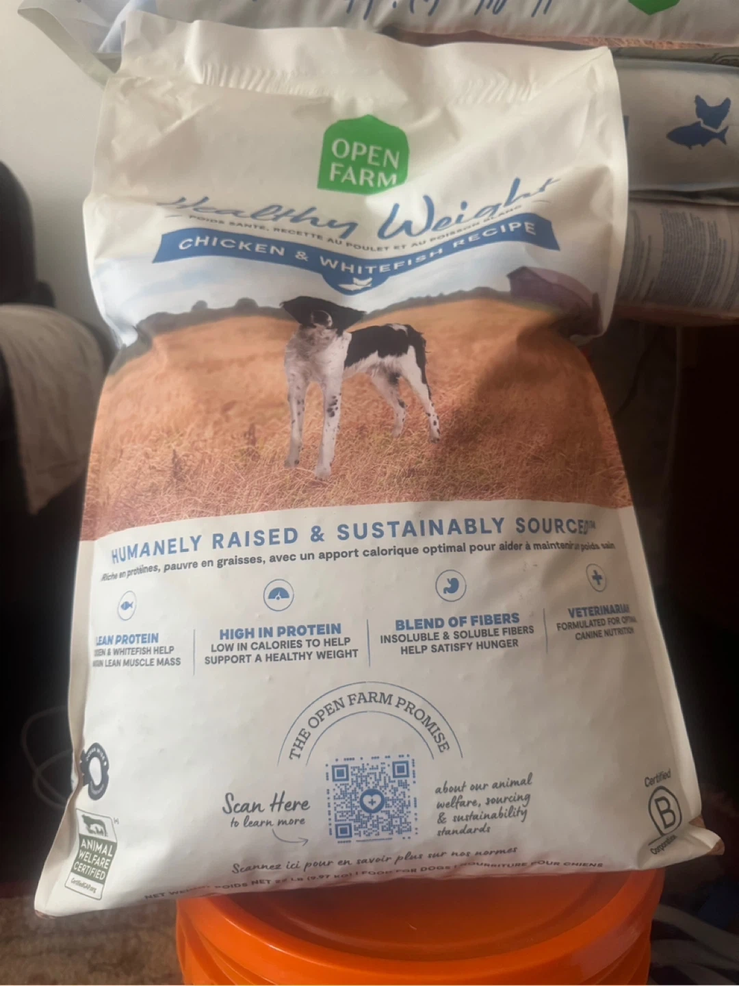 Open Farm Healthy Weight Chicken & Whitefish Recipe dog food bags. Each bag is 20lbs. This recipe is humanely raised and sustainably sourced. It's formulated for optimal weight management.