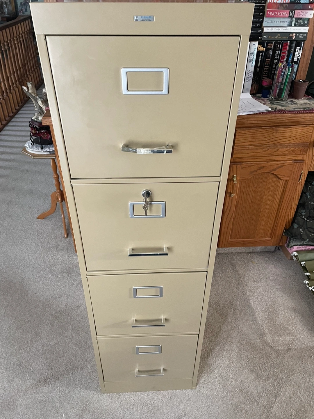 127Looking to sell this beige, four-drawer steel filing cabinet. It's in good condition and perfect for organizing your important documents. It comes with a lock and key for security. The drawers are spacious and ready to hold all your files top handle is broken needs to be replaced light filing cabinet it is 15x18x52 easy to store cash only please no e-transfers thank you