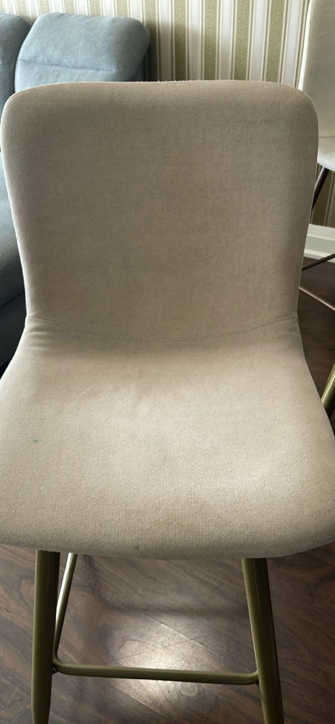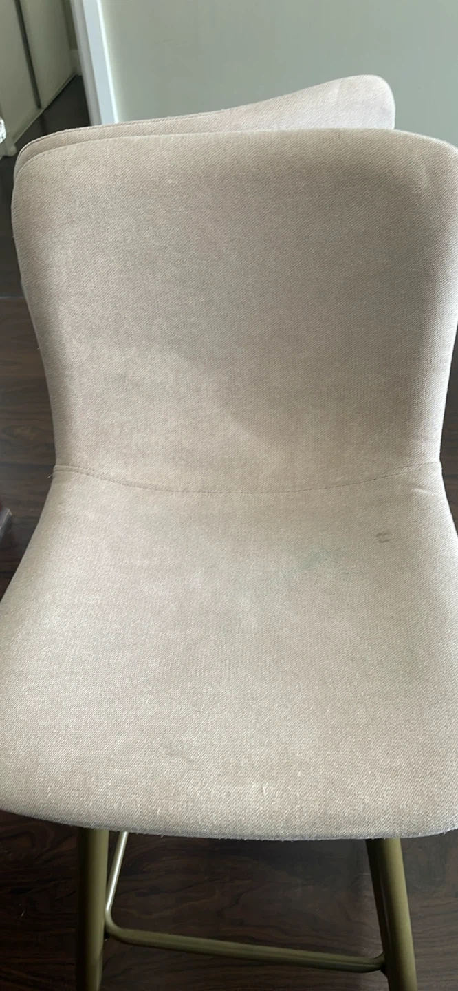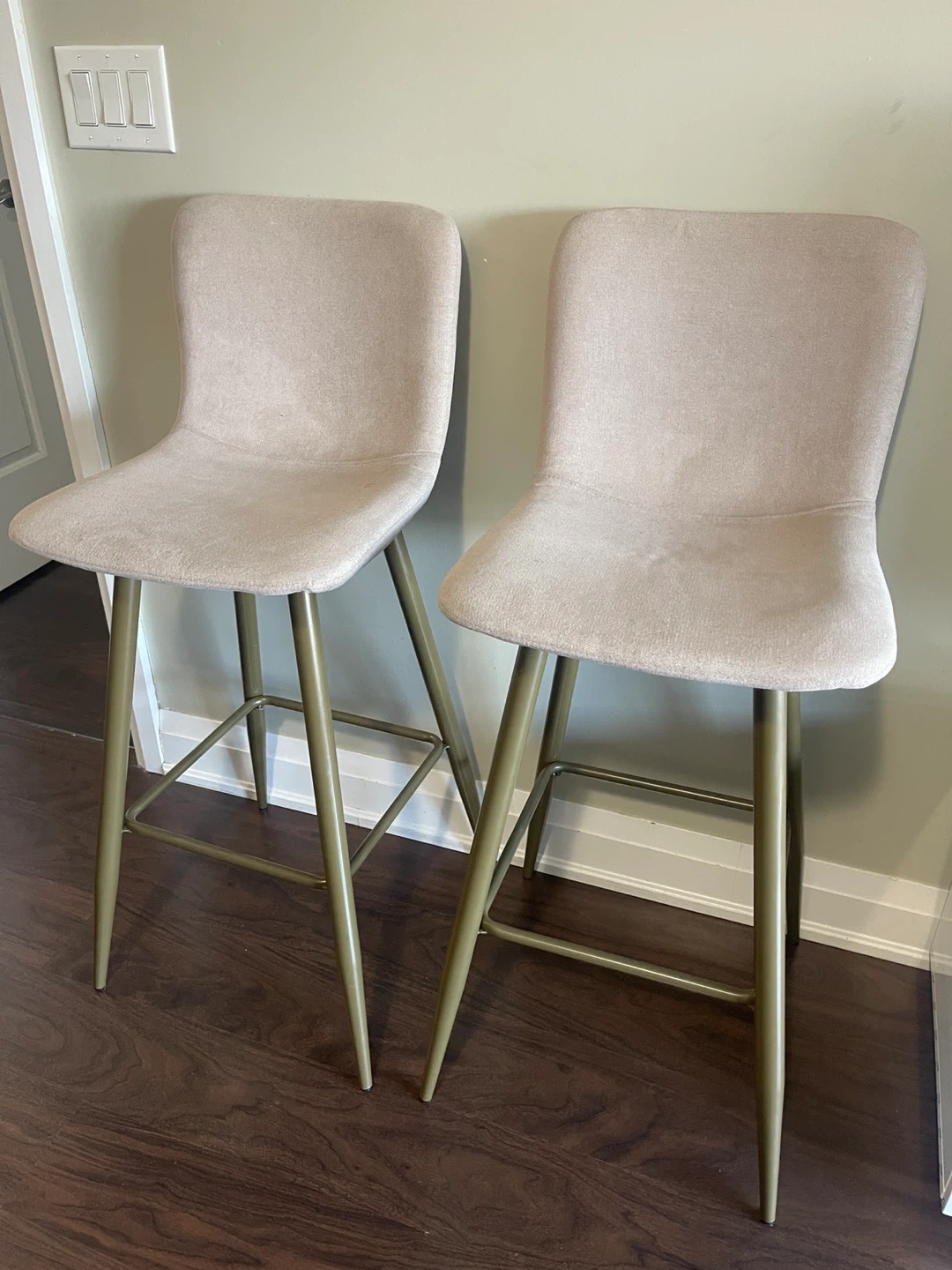 Selling a set of two beige bar stools. The stools have a seat height of 29 inches, a seat width of 14 inches, and an overall height of 40 inches. The legs are a gold colour. Great for adding a touch of elegance to your kitchen or bar area!