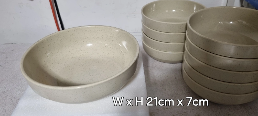 Selling a set of 20 beige bowls. They are in great condition(new) and measure approximately 21cm in width and 7cm in height. Perfect for everyday use!