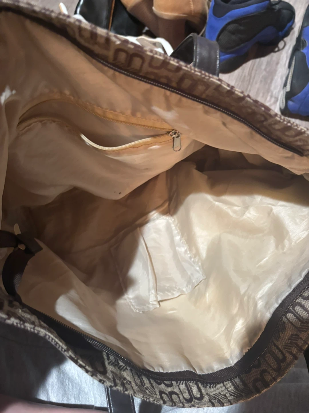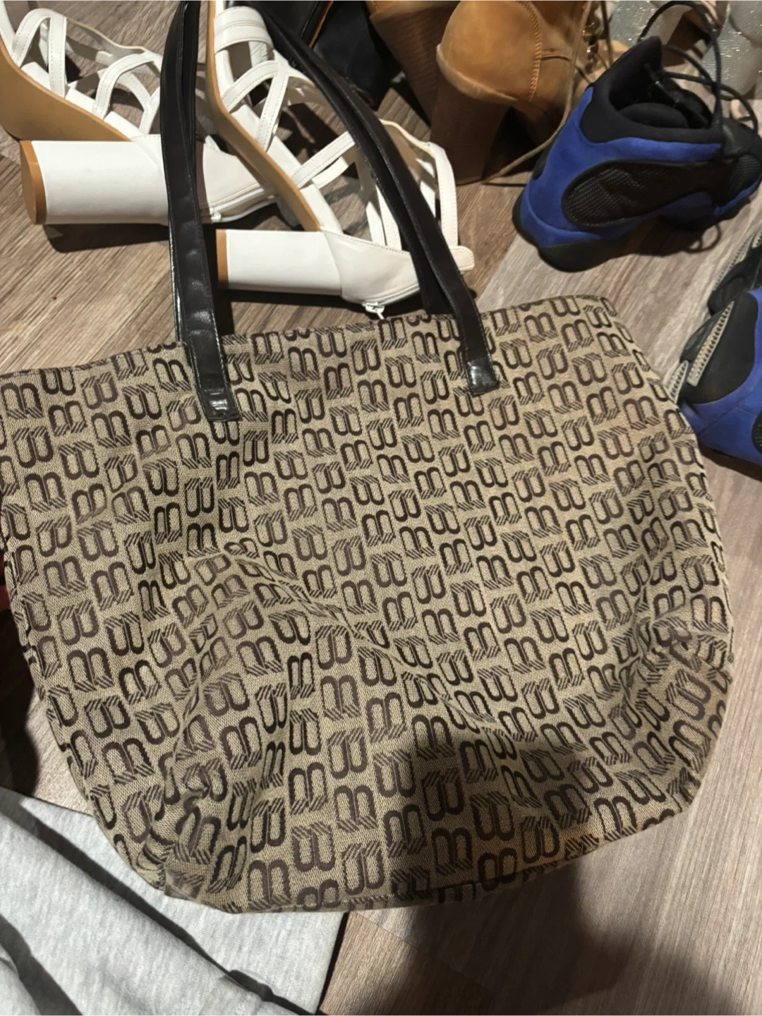 65A stylish tote bag featuring a beige and brown patterned design. It has black handles and a spacious interior with a zippered pocket, perfect for everyday use