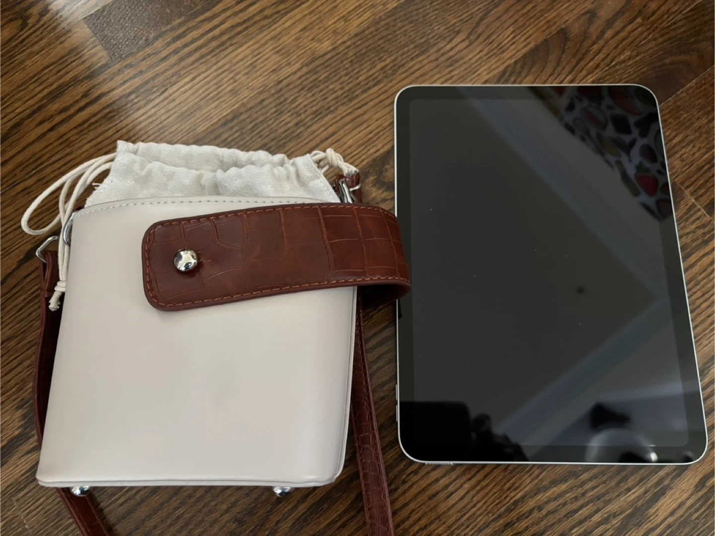 This cute bucket crossbody bag features a neutral beige body with stylish brown crocodile-print accents on the straps and trim. It has a drawstring closure and an adjustable shoulder strap. Perfect for everyday use!