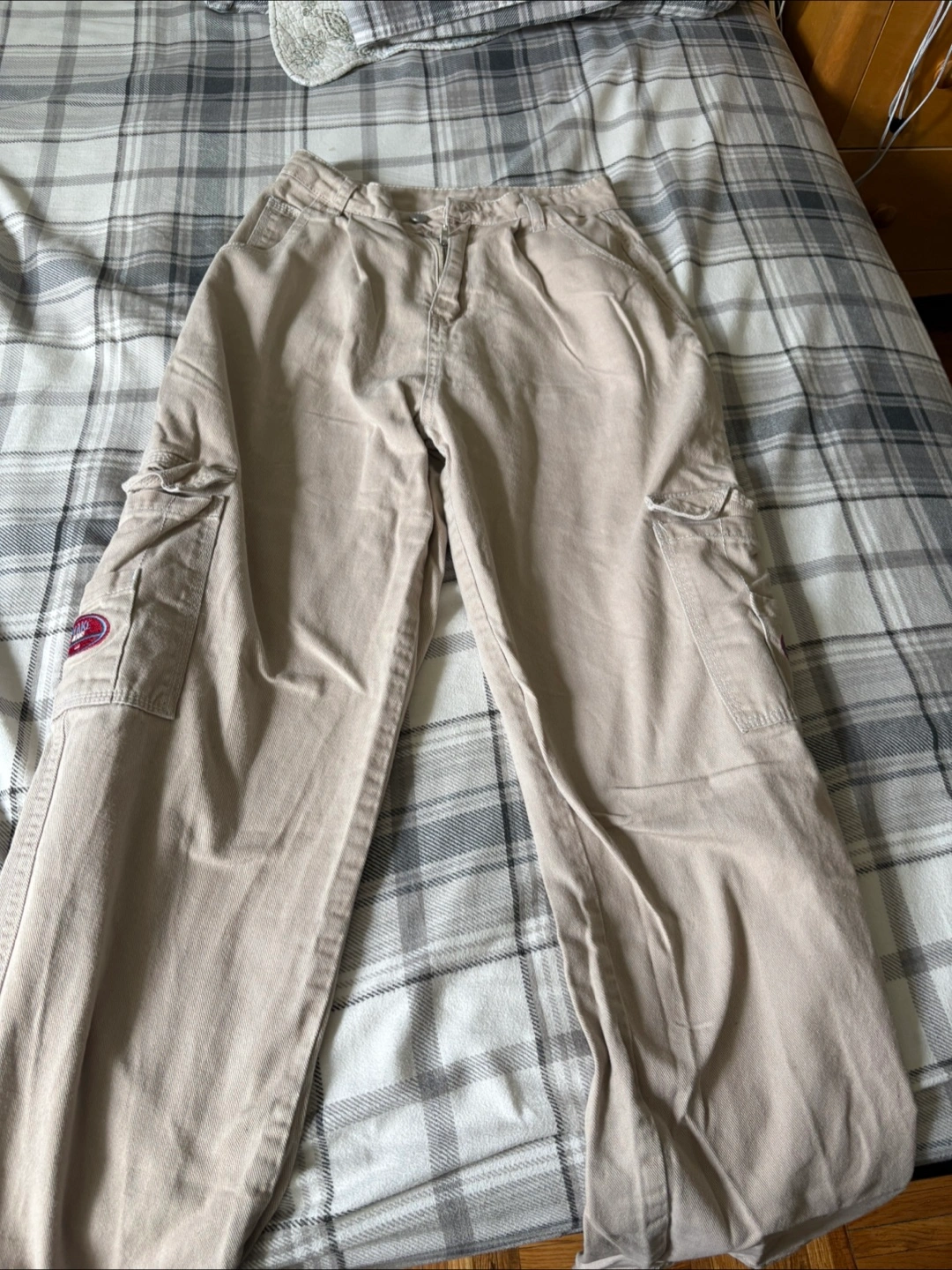 63Lightweight beige cargo pants. Features multiple pockets. Relaxed fit. 85% Cotton 15% Polyester