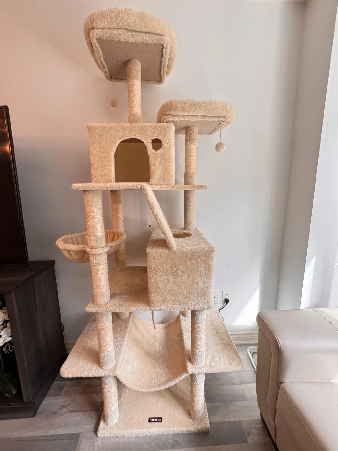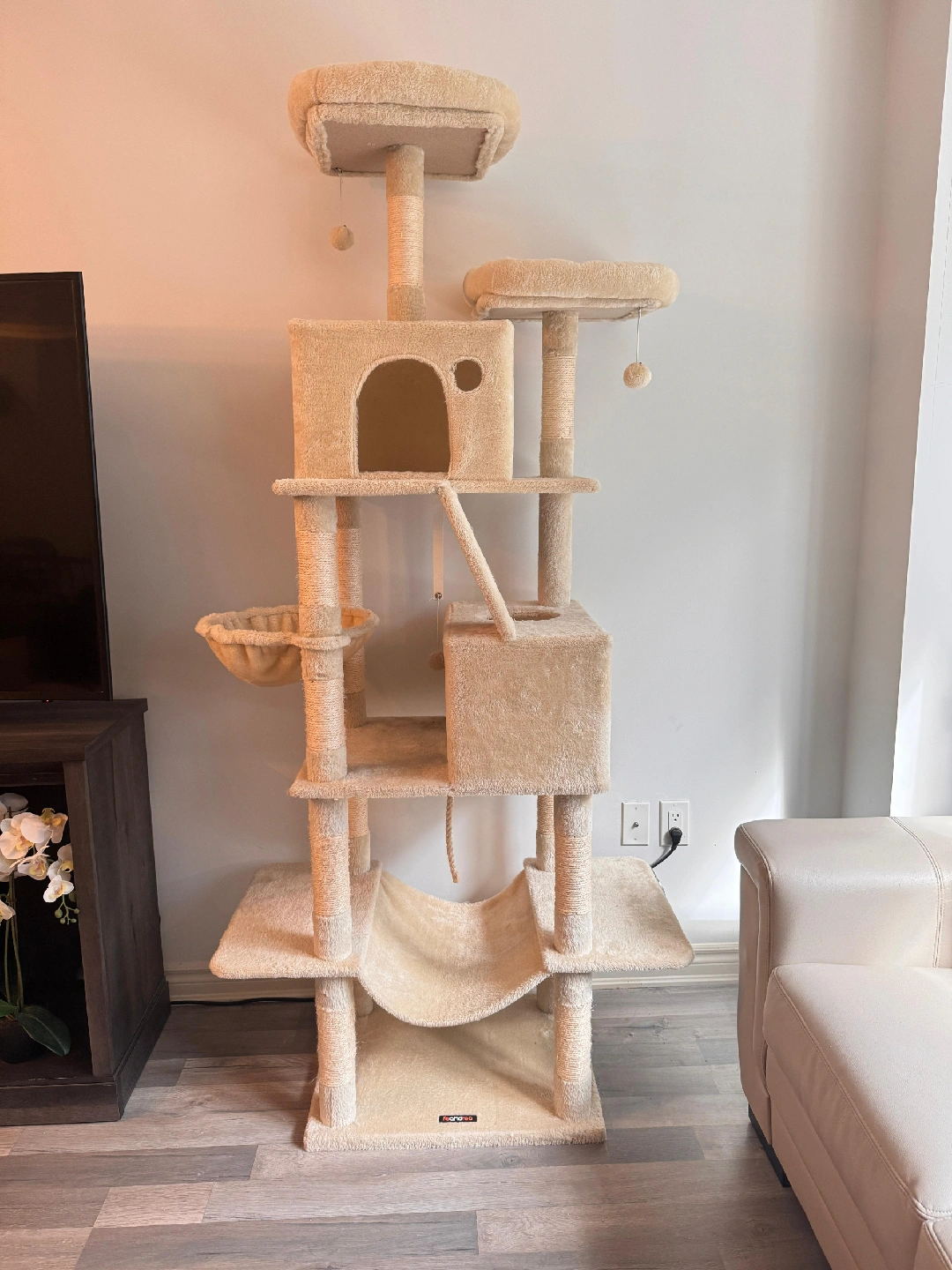 Looking to give your furry friend the ultimate playground? This beige cat tree condo is purr-fect! It features multiple levels, a cozy condo, scratching posts, and even a hammock for lounging. It's in great condition and ready for a new home!
