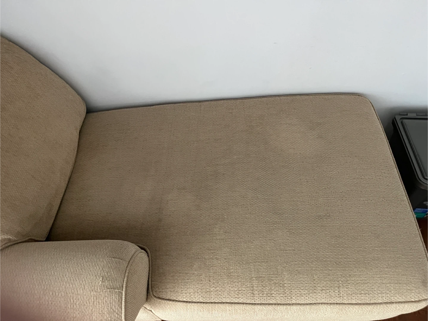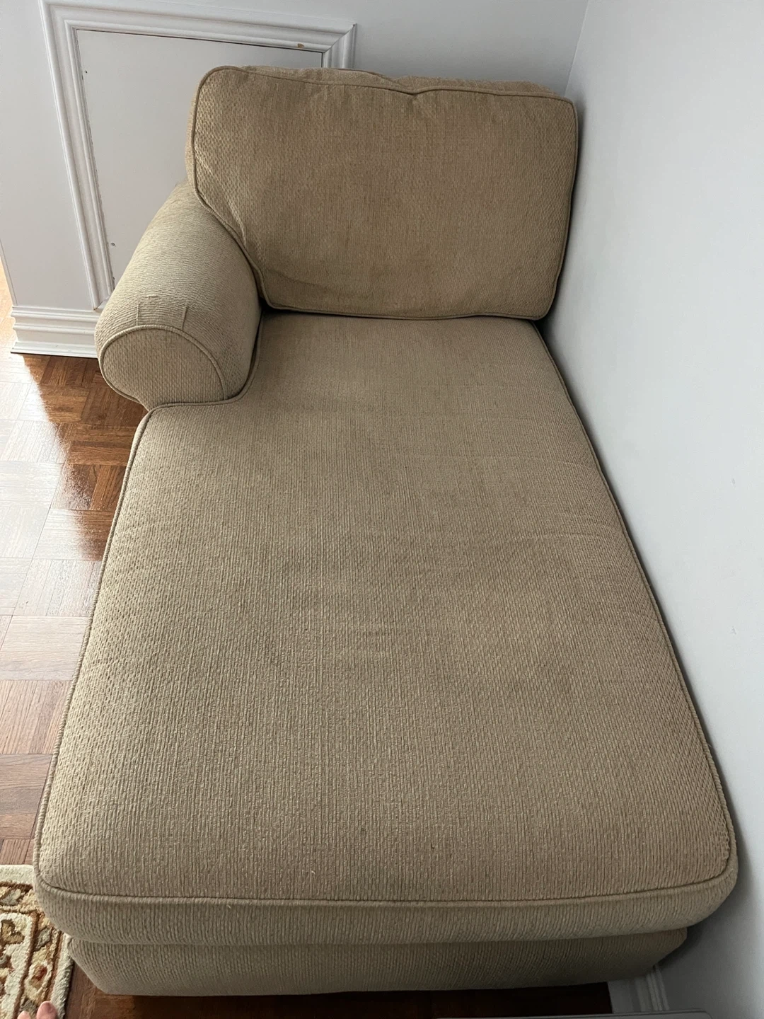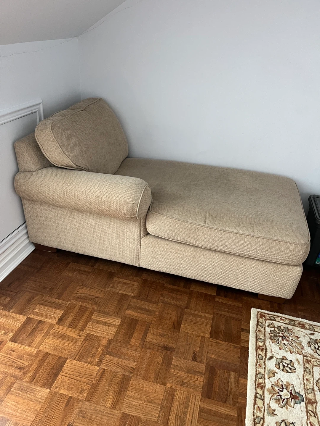 Selling a comfy chaise lounge in a neutral beige colour. It's perfect for relaxing and adding a touch of elegance to any room. It's in fair condition and ready for a new home! Best offers appreciated.