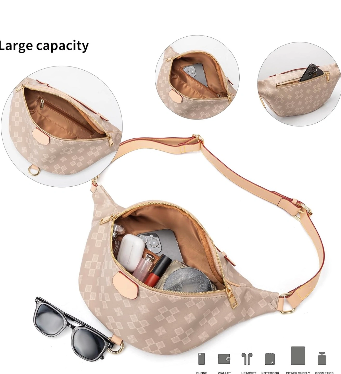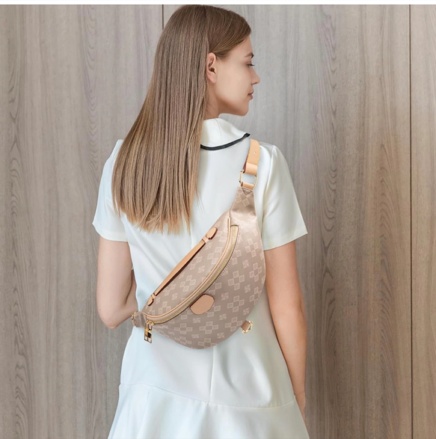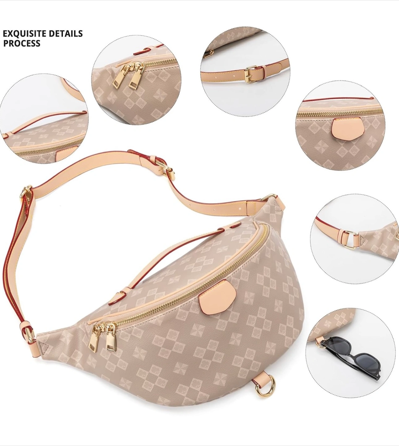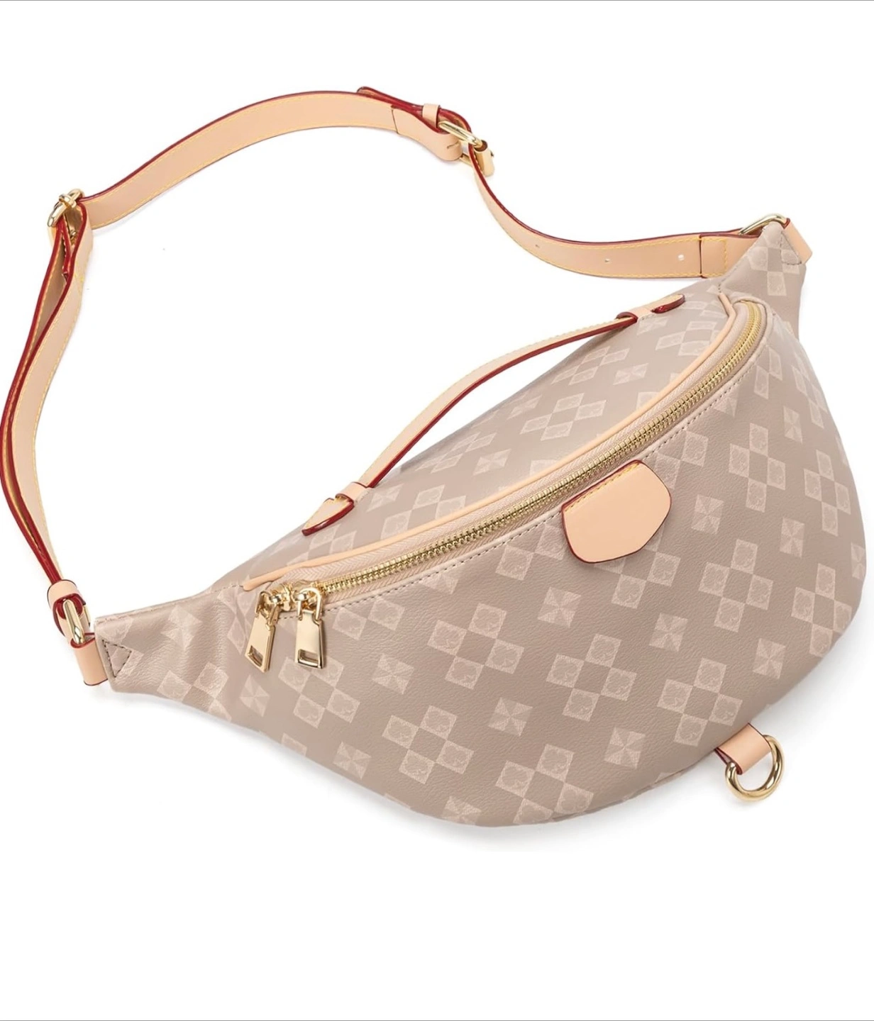 Stylish beige fanny pack. Features a unique patterned design. Adjustable strap. Multiple compartments. Roomy interior. Perfect for everyday use.
