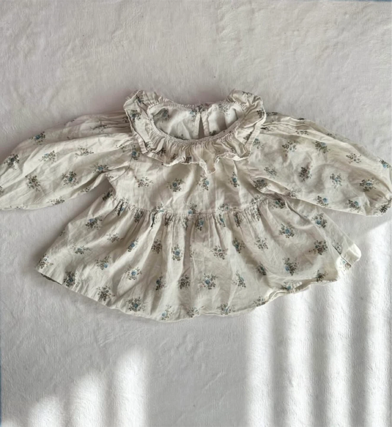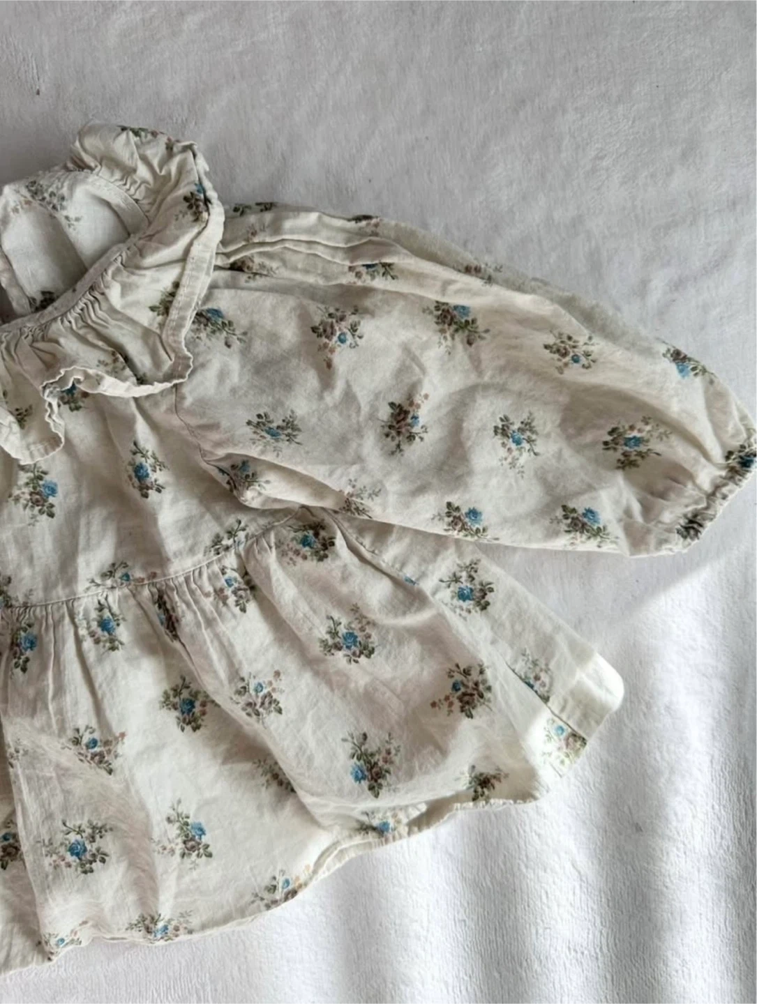 10Cute floral baby blouse in great condition! Perfect for your little one. The blouse features a ruffled collar and long sleeves. It's a beautiful piece for any occasion! Made in Korea In a pet-free and smoke-free home