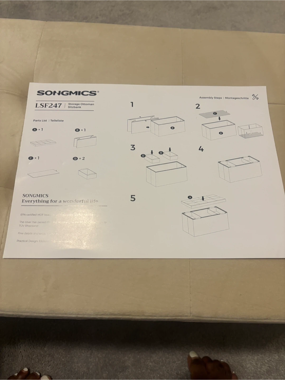 202This SONGMICS foldable storage ottoman bench is perfect for adding extra storage and seating to any room! It has a 24 Gal (89L) capacity and comes with 2 extra storage boxes. The dimensions are 30" x 15" x 15" (76 cm x 38 cm x 38 cm). It can hold a max static load capacity of 660 lb (300 kg).available for pickup and delivery