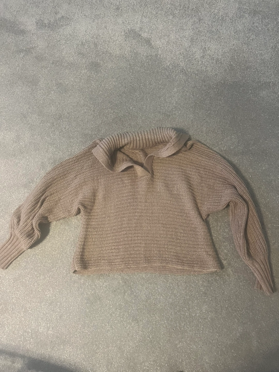 Cozy up in this beige knit cropped sweater! It's a size small and perfect for layering or wearing on its own. The neutral colour makes it easy to pair with anything in your wardrobe. It's in great condition and ready for a new home