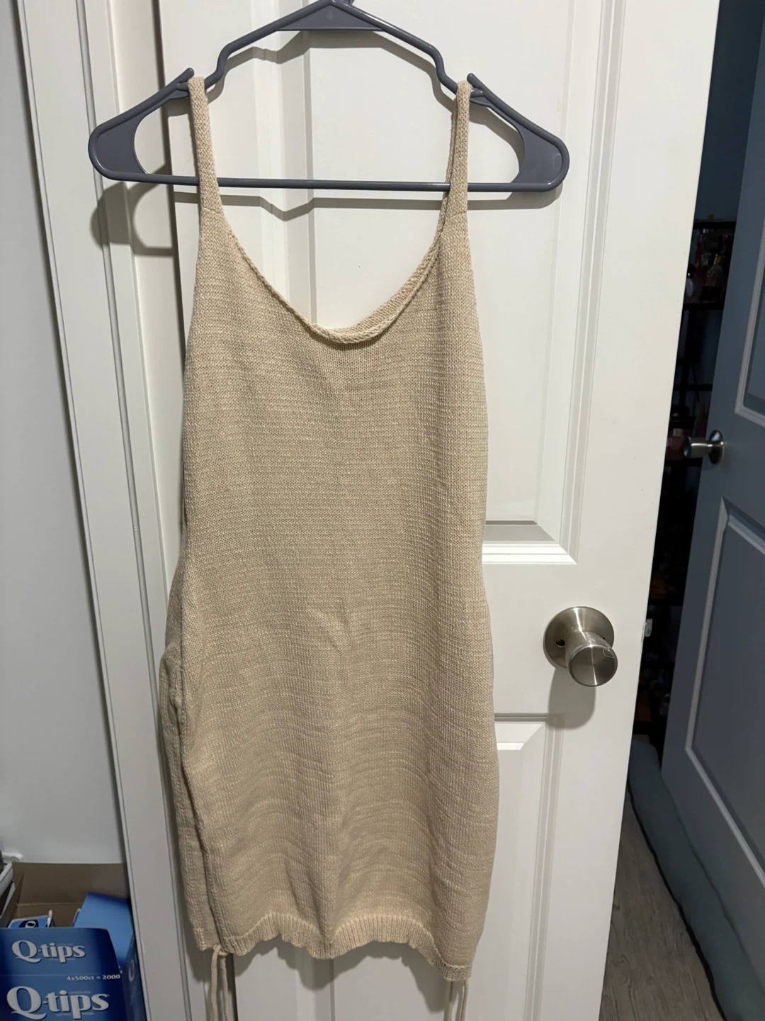 Selling a cute beige knit mini dress! It's in great condition and perfect for summer. The dress has a simple, stylish design and is made from a comfortable knit material.