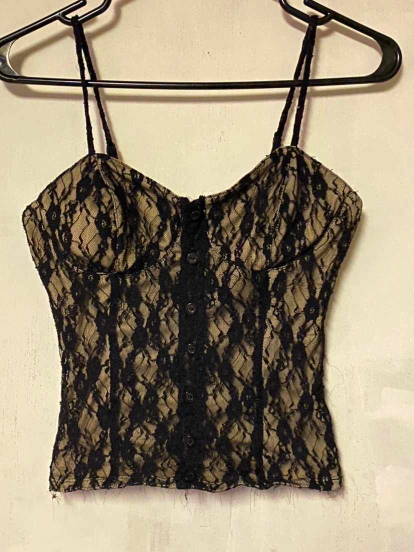 15A black lace top with straps. It has a button up front and a nude lining. The top is in a cropped style. Hugging the waist gently.