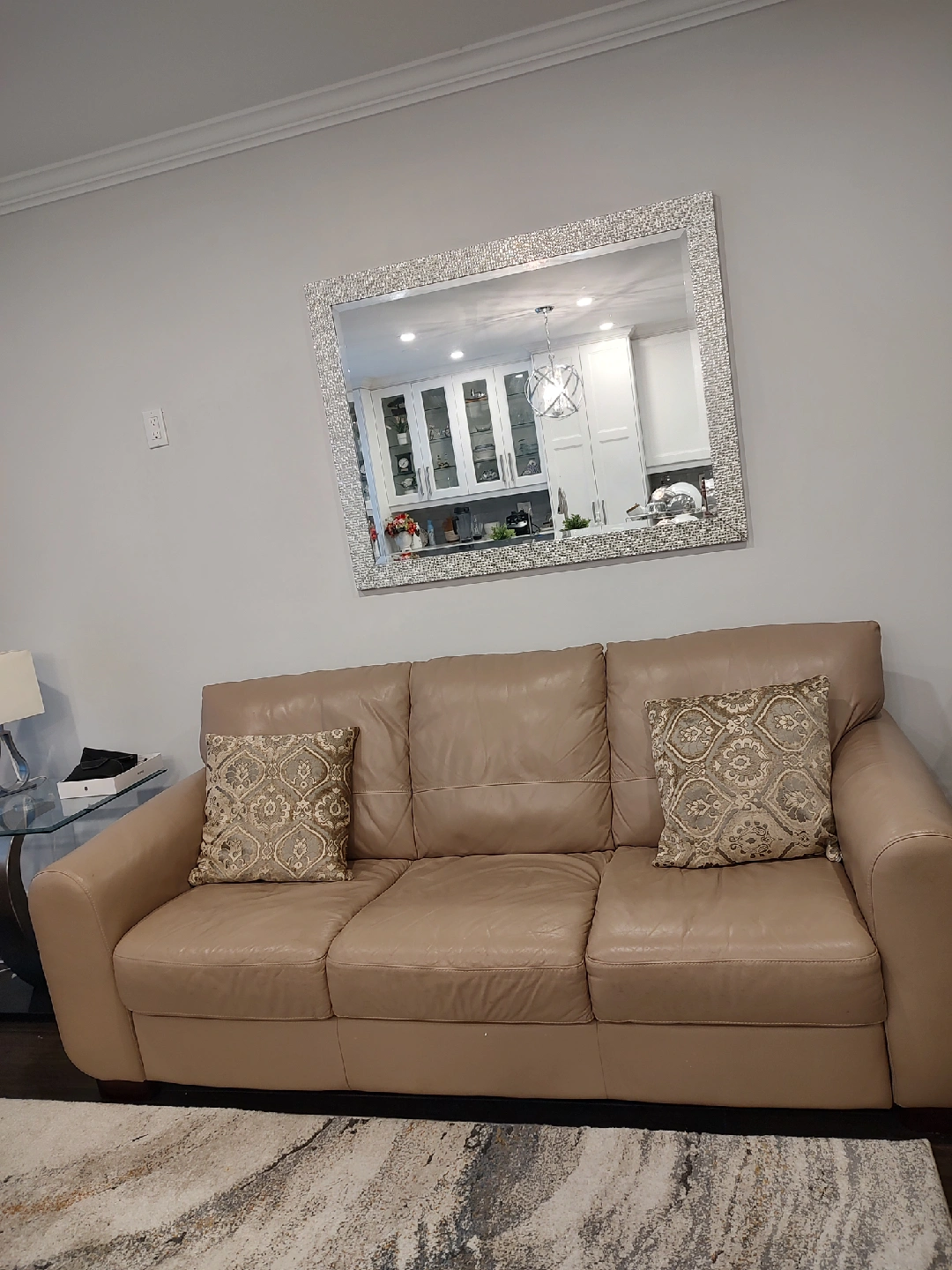 18Selling a comfy beige leather sofa and loveseat set! Perfect for a living room or family room. The set includes a three-seater sofa and a two-seater loveseat, both in good condition and ready for a new home. From pet free and smock free home .