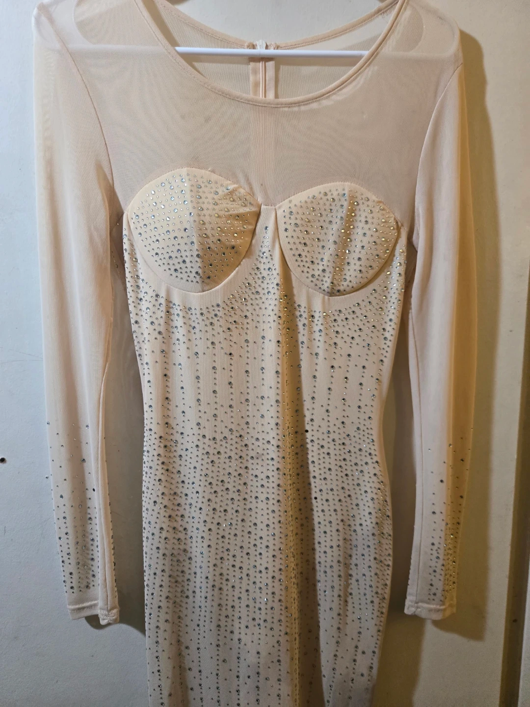65Selling a beige long sleeve mini dress. It features a mesh top and long sleeves, with a fitted bodice and a rhinestone design throughout. It's perfect for a night out!