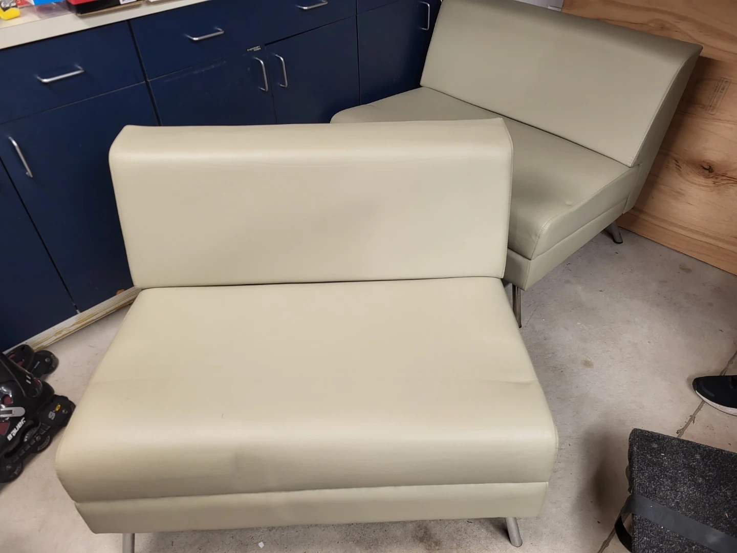 10Selling a set of three modular sofa chairs in a neutral beige colour. They feature a minimalist design with sleek metal legs. Perfect for creating a flexible seating arrangement in your living room or office space. These chairs are in great condition and ready for a new home!