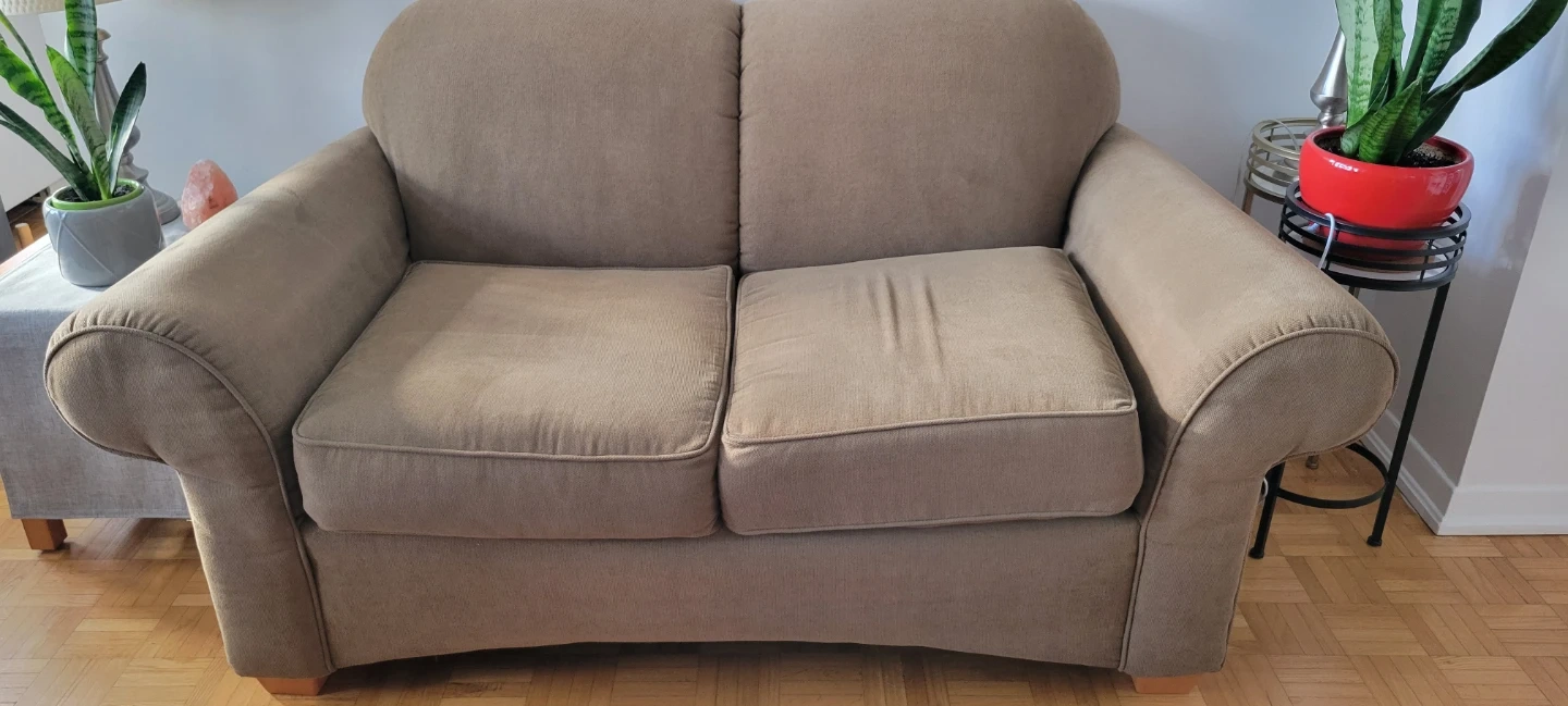 10Selling my beige loveseat in excellent condition. It’s very comfortable and perfect for a small space or as extra seating. Condition: Like new, smoke-free and pet-free home Dimensions: Length (arm to arm): 61 inches Width (back to front): 40 inches Seat height (cushion to floor): 15 inches