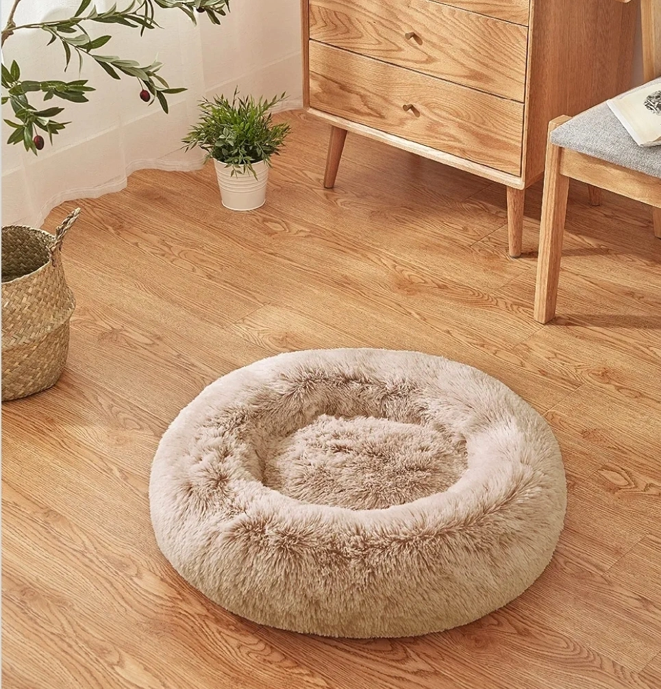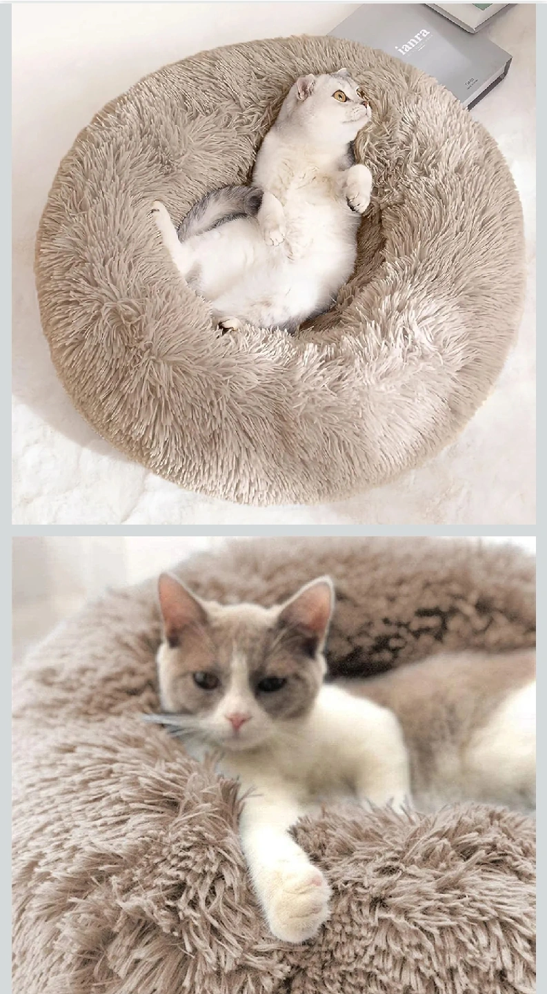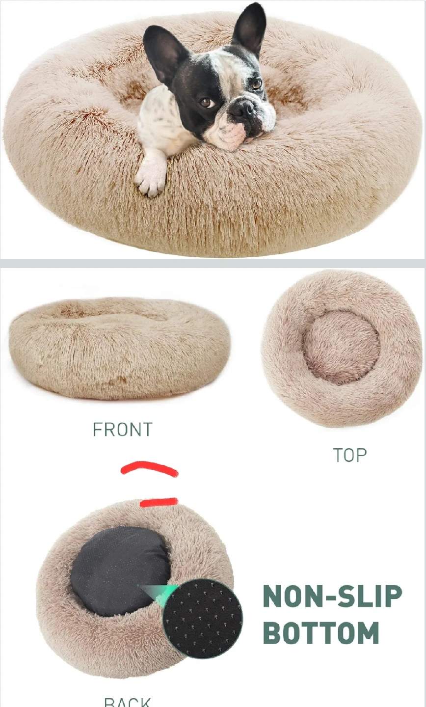 Snuggle up your furry friend with this cozy beige plush donut pet bed! It's perfect for cats or small dogs who love to curl up and feel secure. The bed has a non-slip bottom, so it stays in place even during the most enthusiastic naps