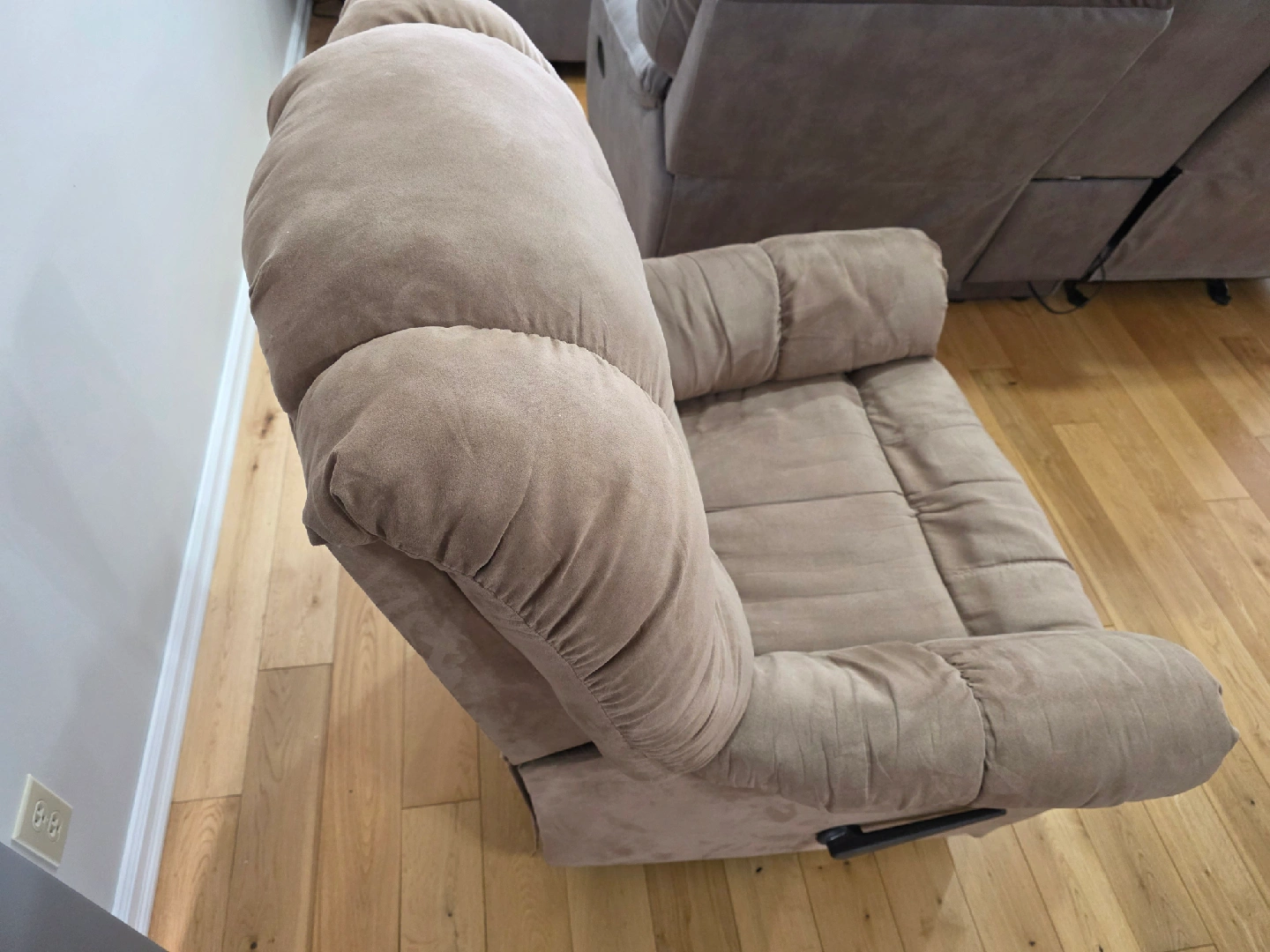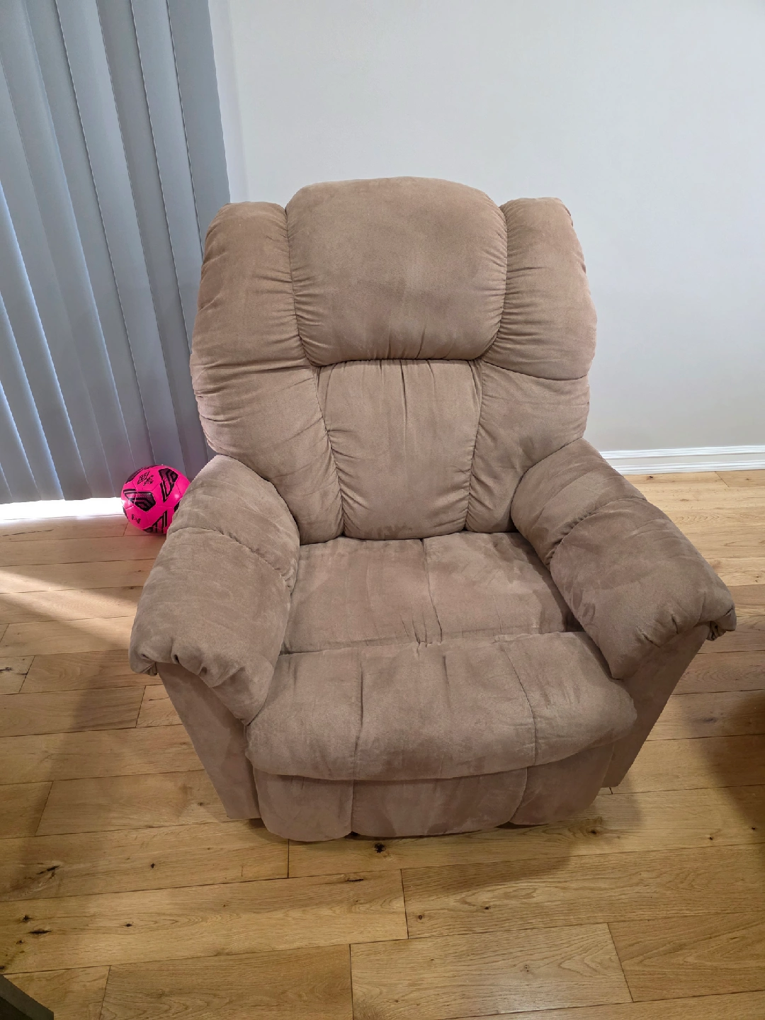 Selling a comfy beige plush recliner chair! It's perfect for relaxing after a long day. can be easily dismantled for transport. this also have rocking function, which is very helpful for nursing mom's! The material is soft and cozy, making it a great addition to any living room or den. It's in great condition and ready for a new home.