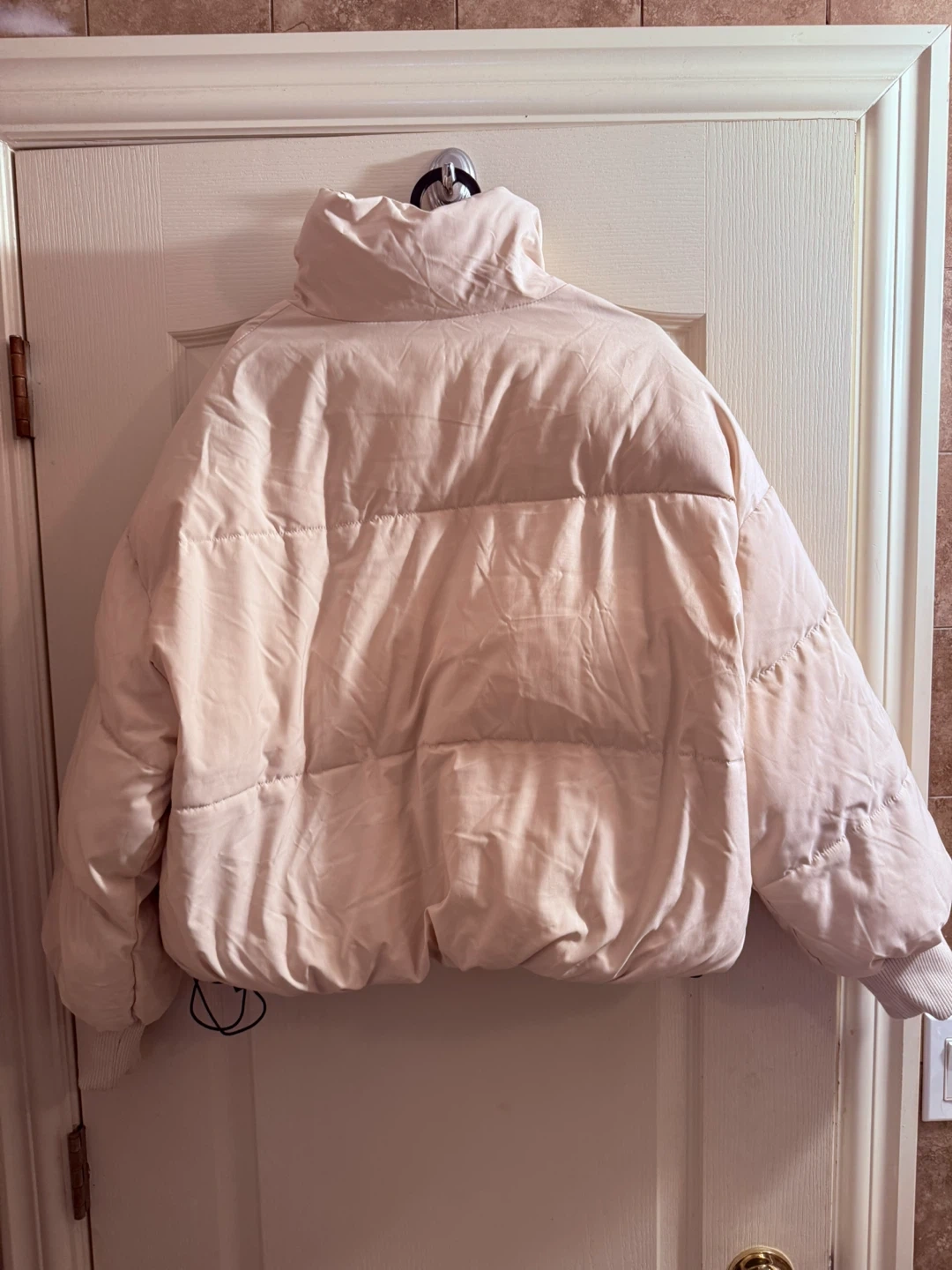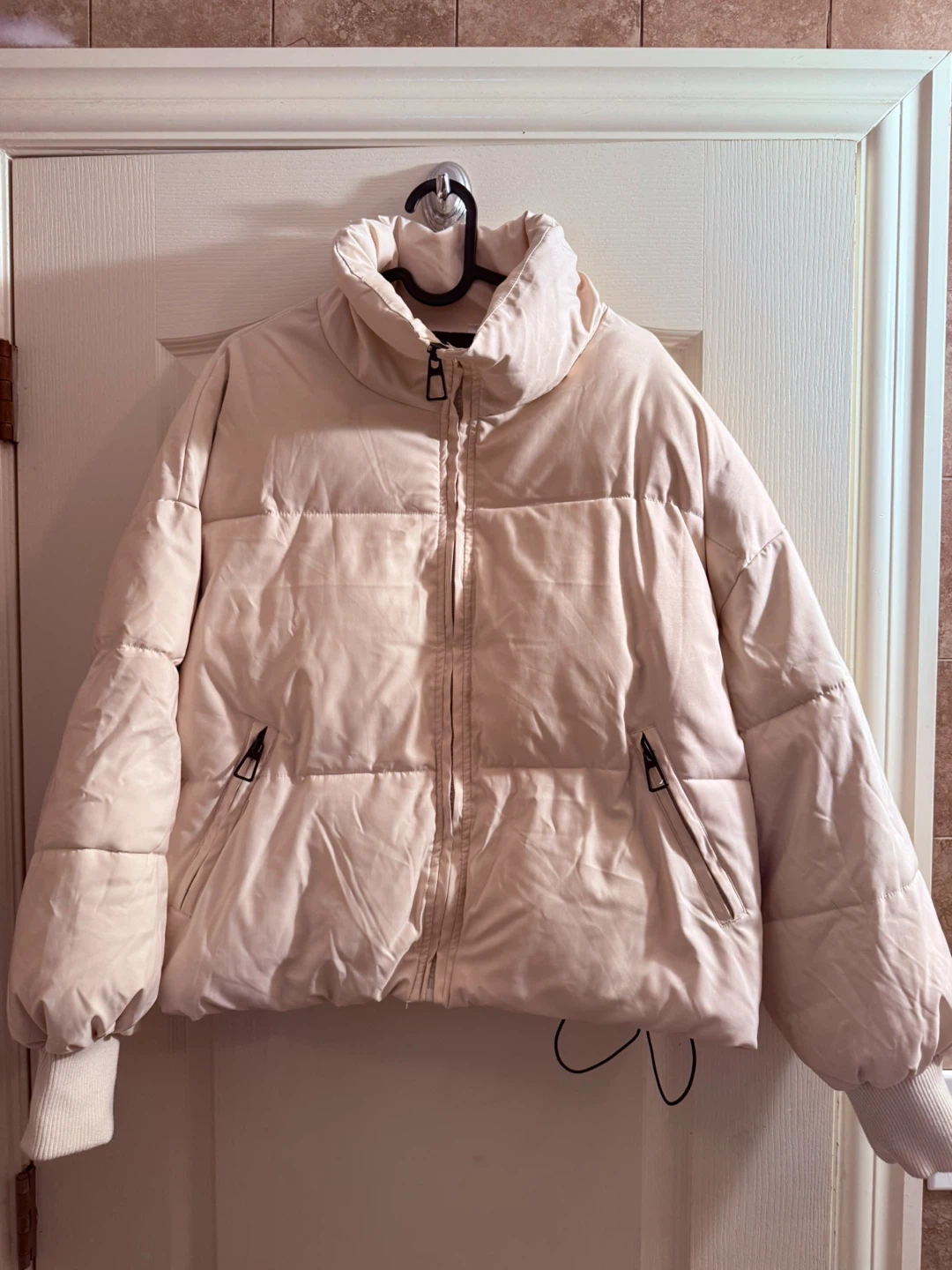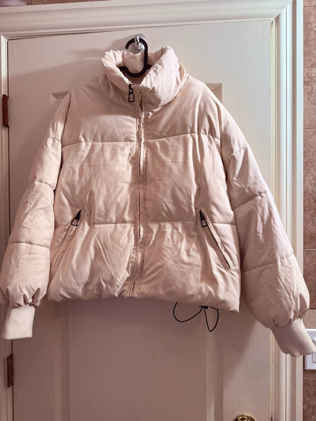 65Selling a cozy beige puffer jacket! It's in great condition and perfect for staying warm during the colder months. It features a high collar and a zip-up front, plus it has convenient pockets on the sides Medium