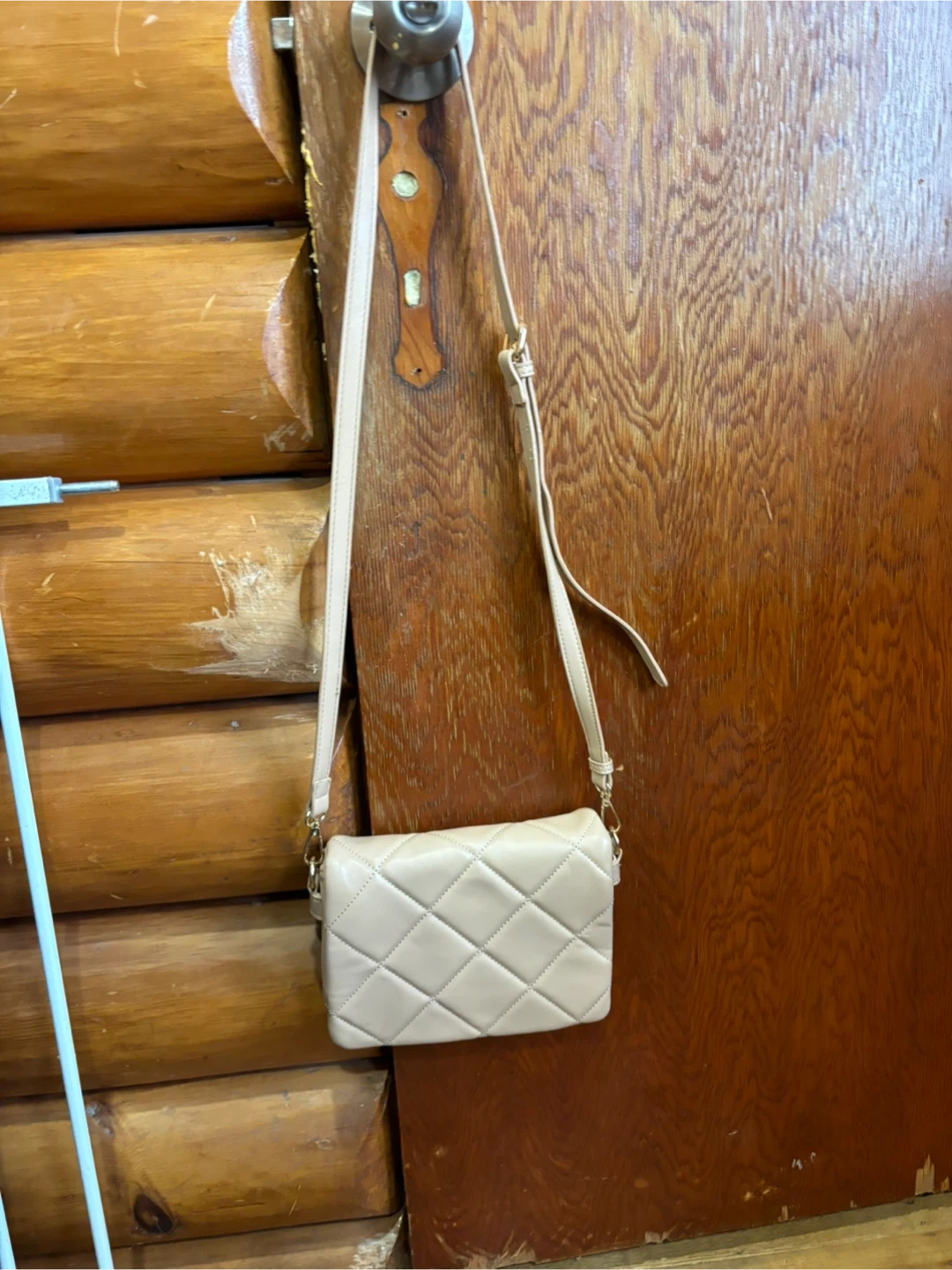 5Selling a cute beige quilted crossbody bag! It's in great condition and perfect for everyday use. The interior has a stylish black and white patterned lining.