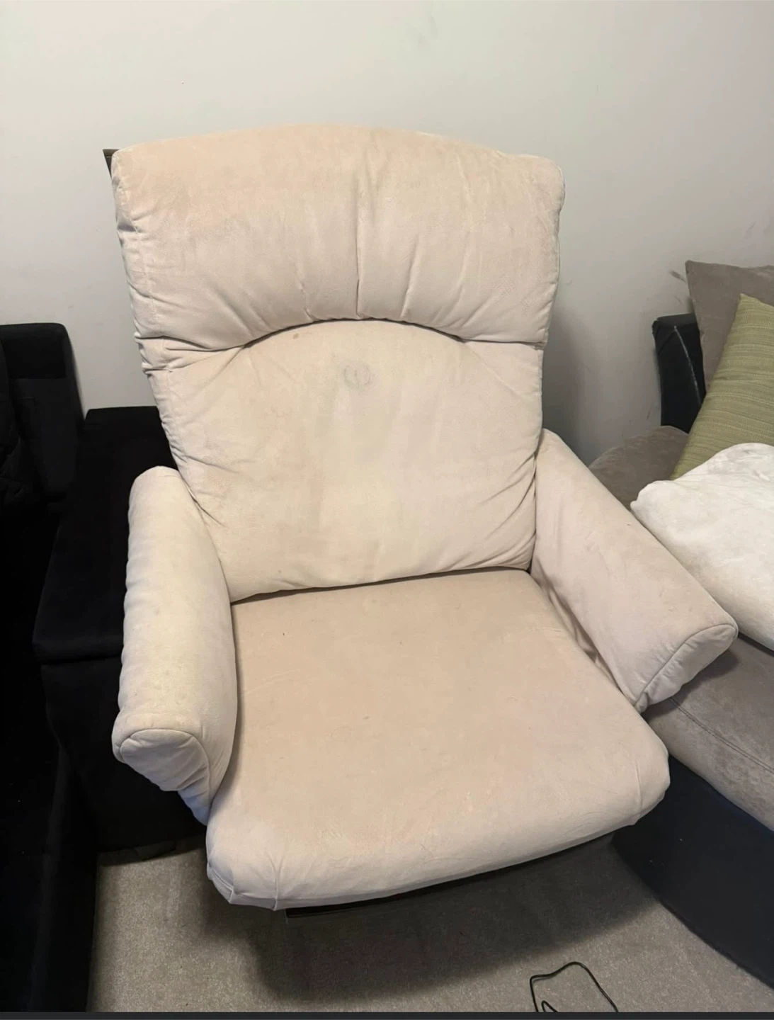 11Selling a comfy recliner chair in a neutral beige colour. It's perfect for relaxing after a long day. There are some signs of wear, but it's still in good condition for its age. It would be a great addition to any living room or bedroom