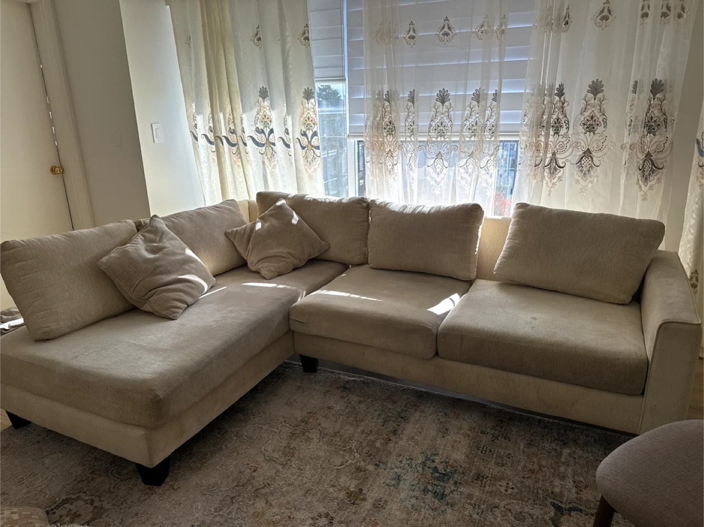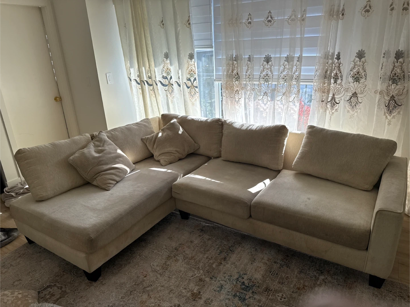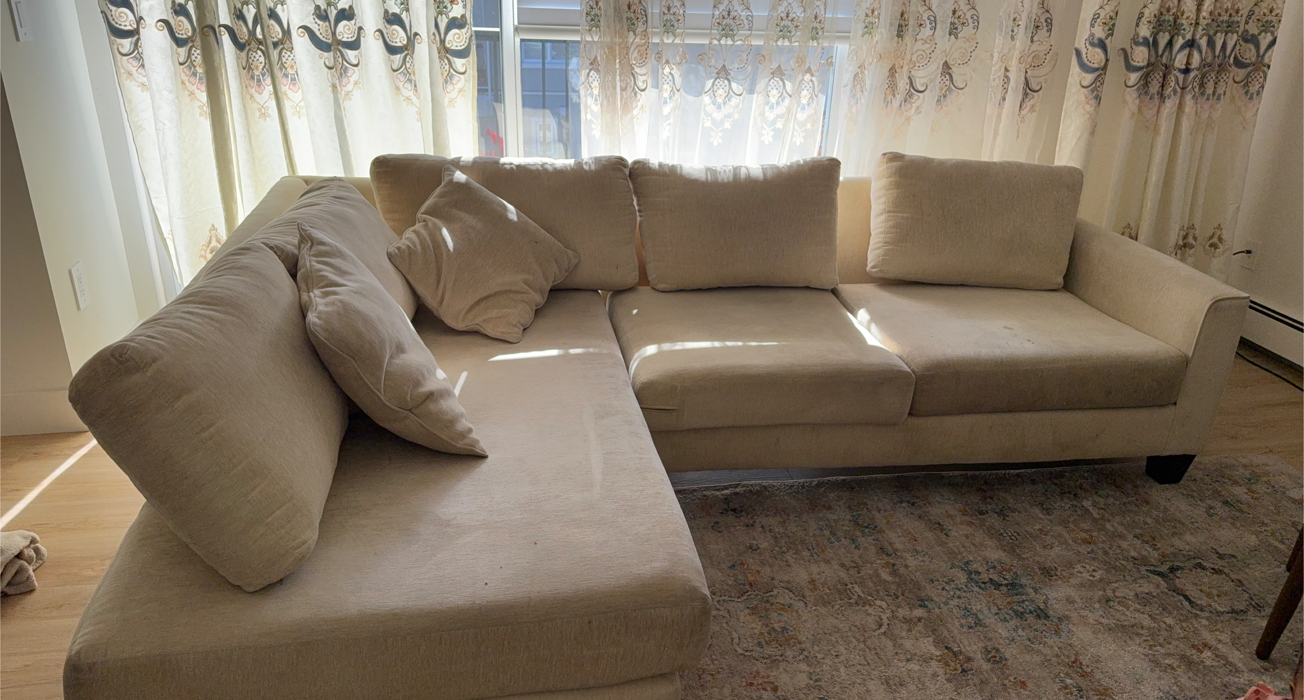 Modern Sectional Sofa-Light beach-tone fabric, No rips, tears, or damage –Just needs a good clean or a slipcover to freshen it up! Perfect for any living space. ✨ Pickup only – message if interested!
