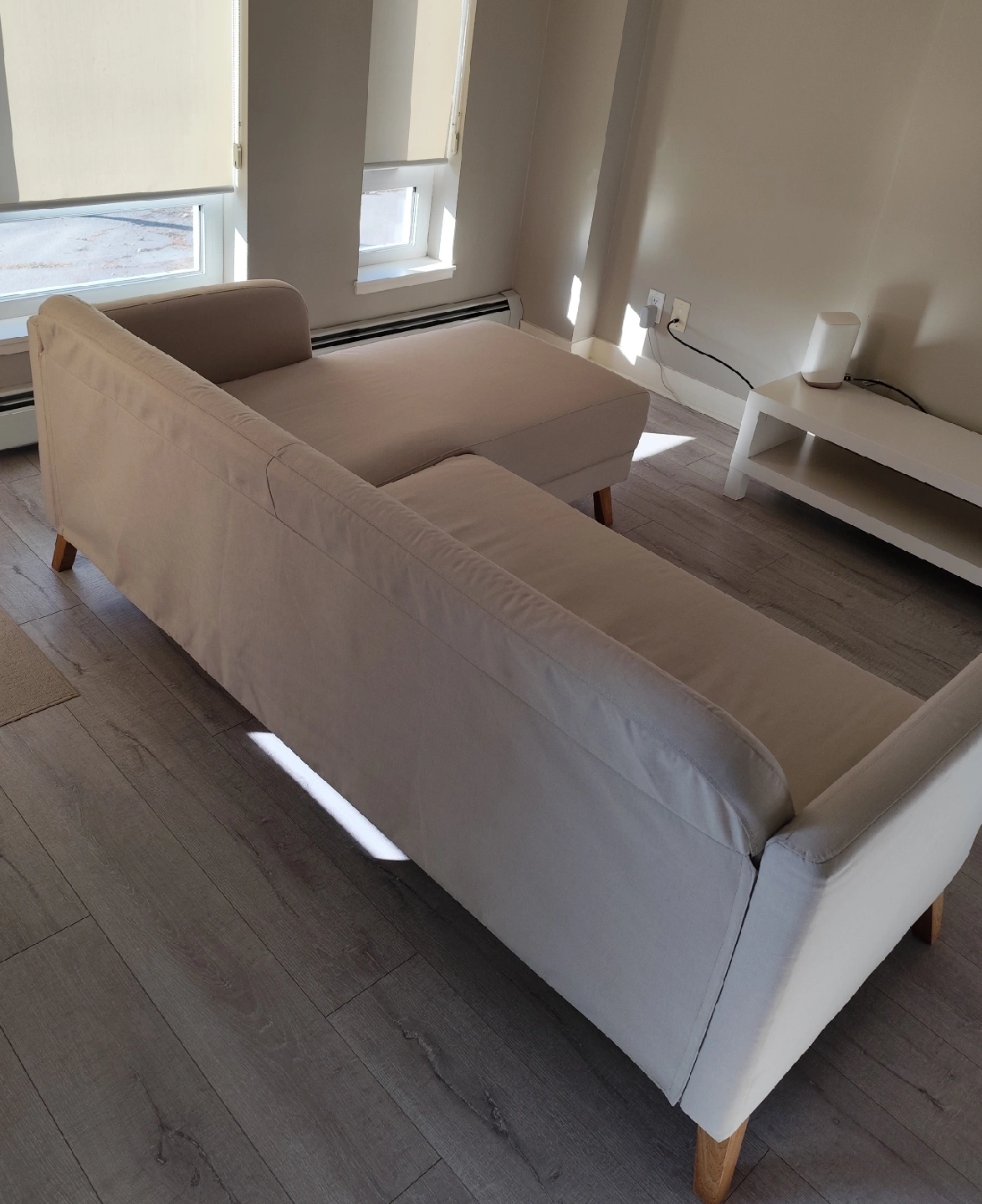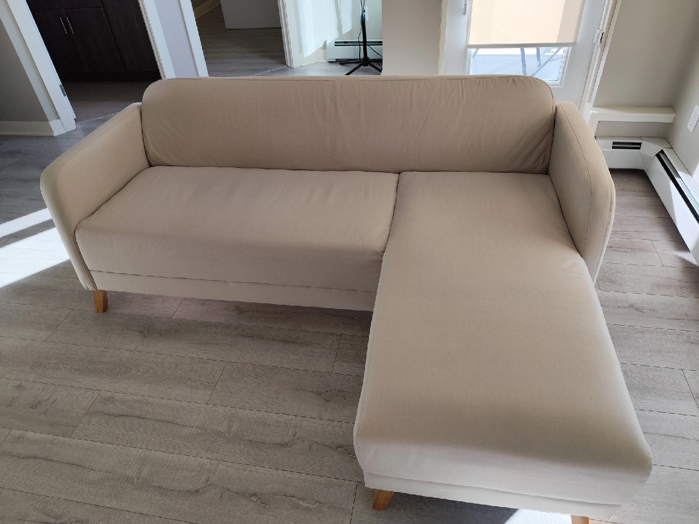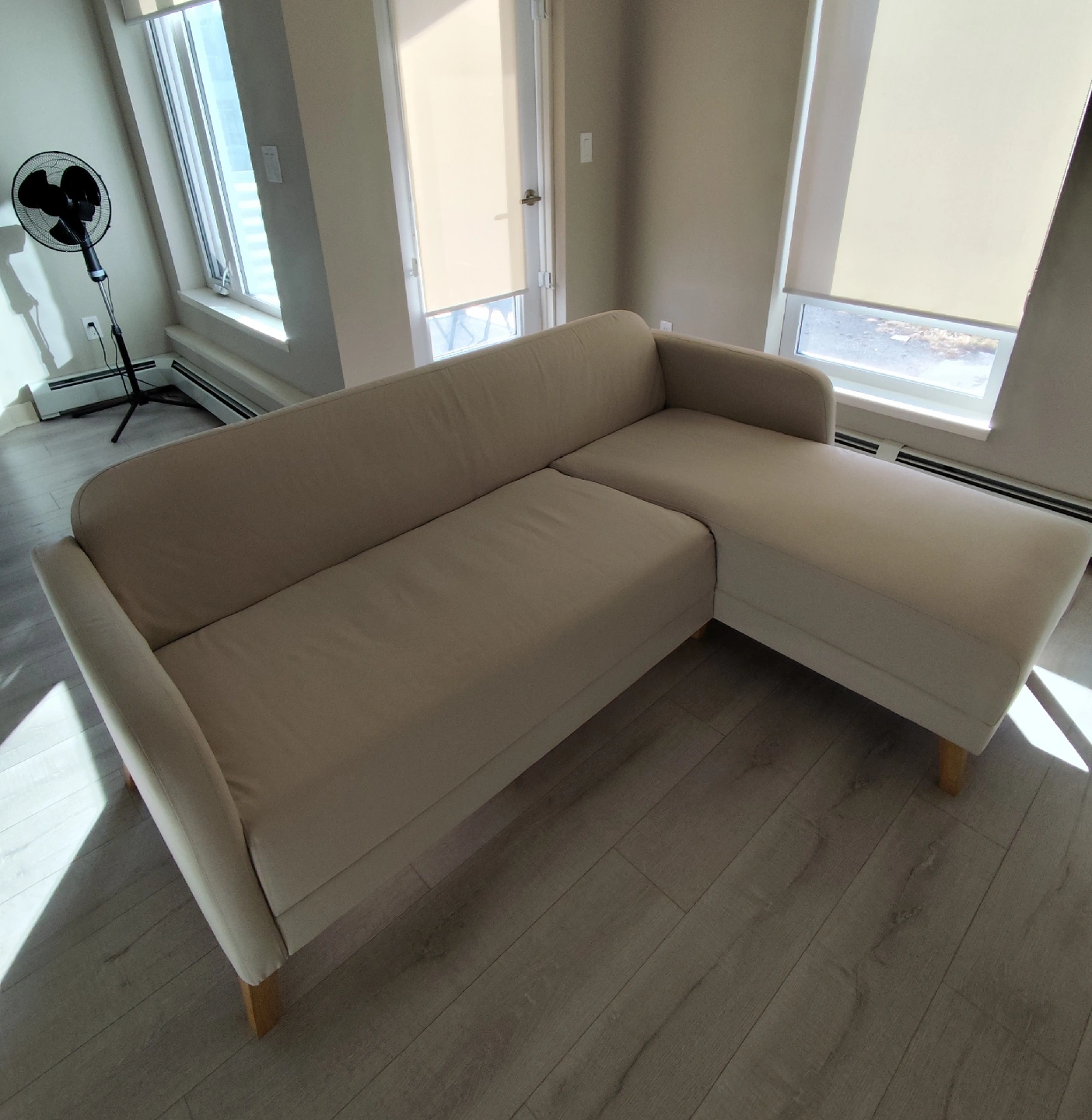 12Selling a comfy beige sectional sofa with a chaise lounge! It's in great shape and perfect for relaxing after a long day. The neutral colour will fit in with any decor. It's a great addition to any living room!