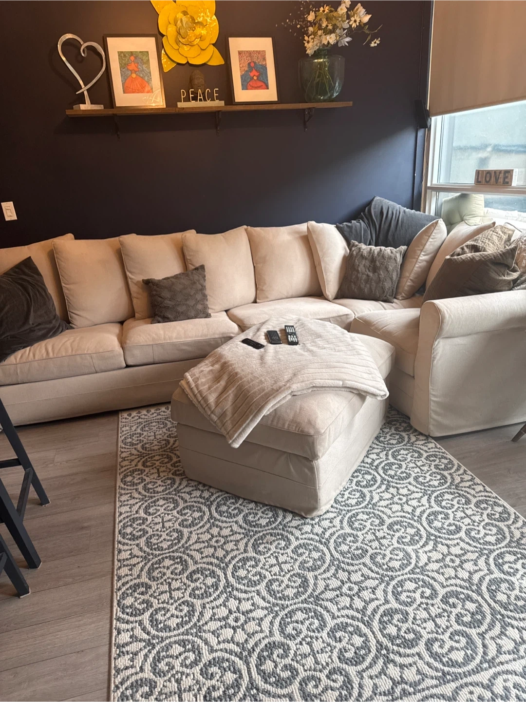 15Selling a comfortable beige sectional sofa that comes with an ottoman. It's in great condition and would be a cozy addition to any living room. Perfect for lounging and relaxing after a long day!