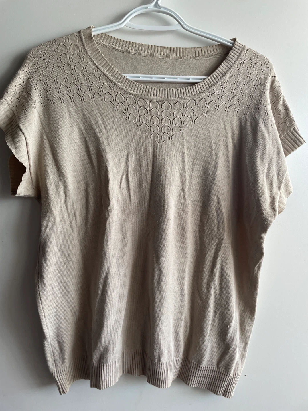 607Selling a short-sleeved knit top in a neutral beige colour. It's in great condition and would be perfect for layering or wearing on its own. The knit pattern adds a nice touch!