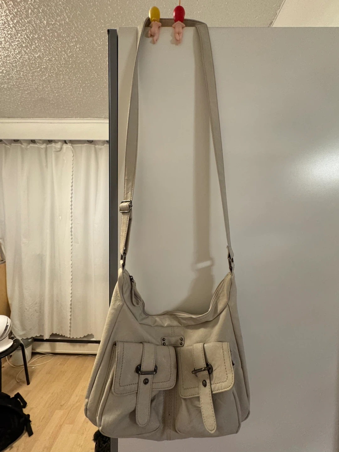 15A lovely beige shoulder bag with a long strap. It features several pockets on the front, perfect for keeping your essentials organized. It's in great condition and ready for a new home!