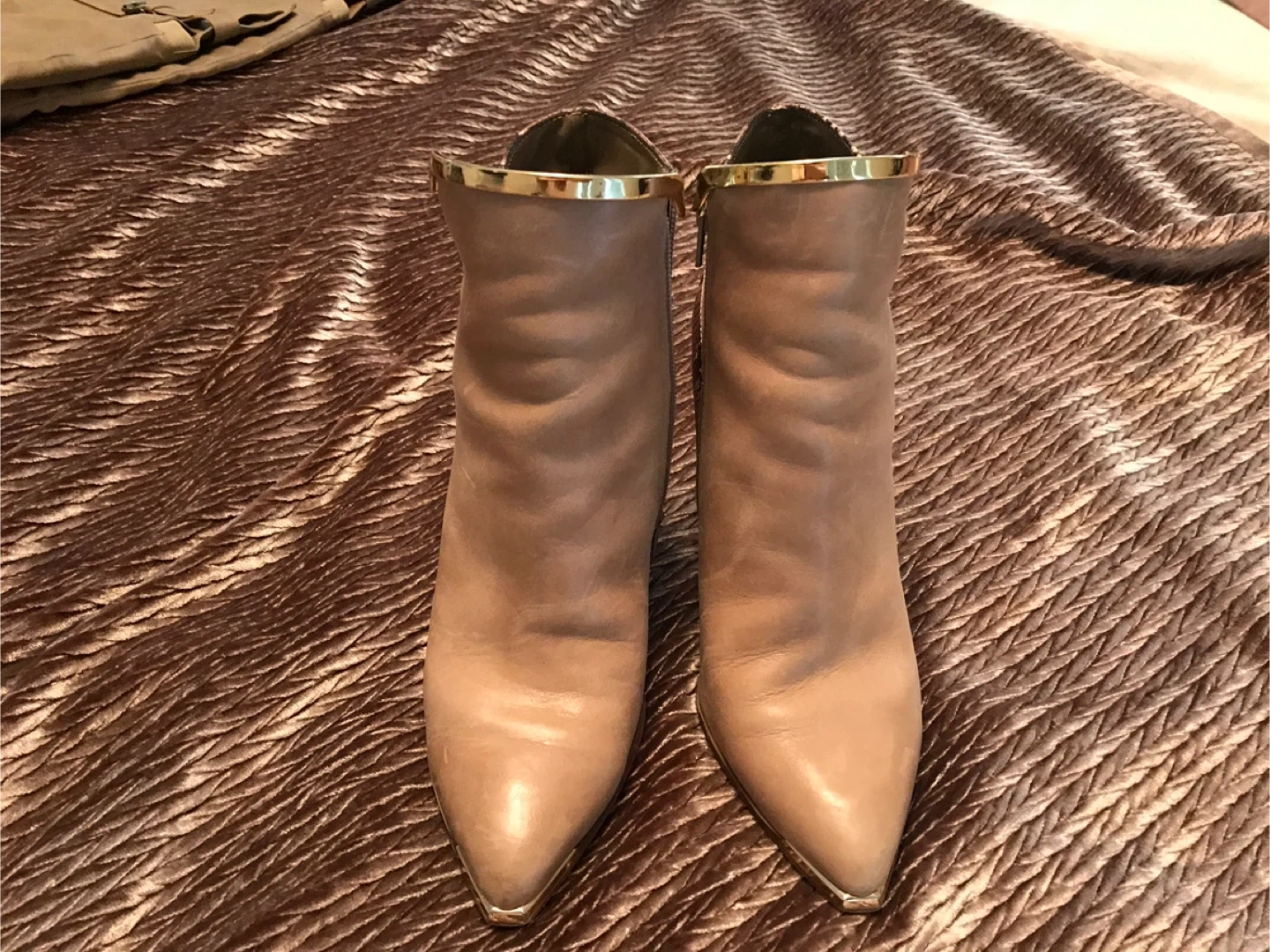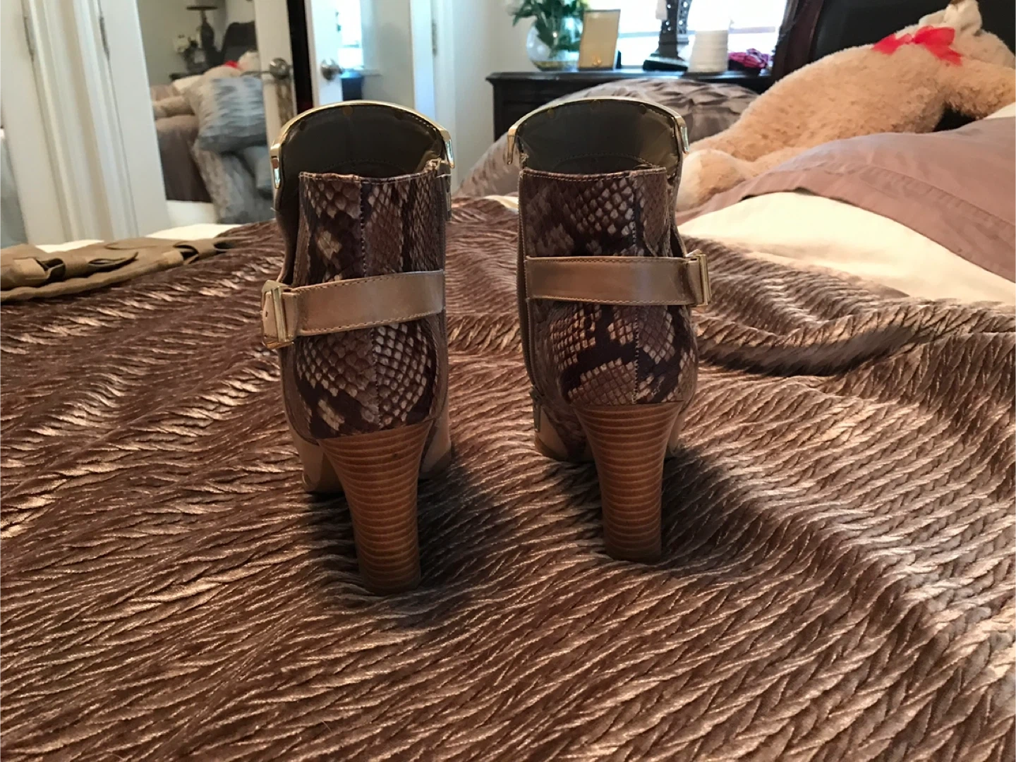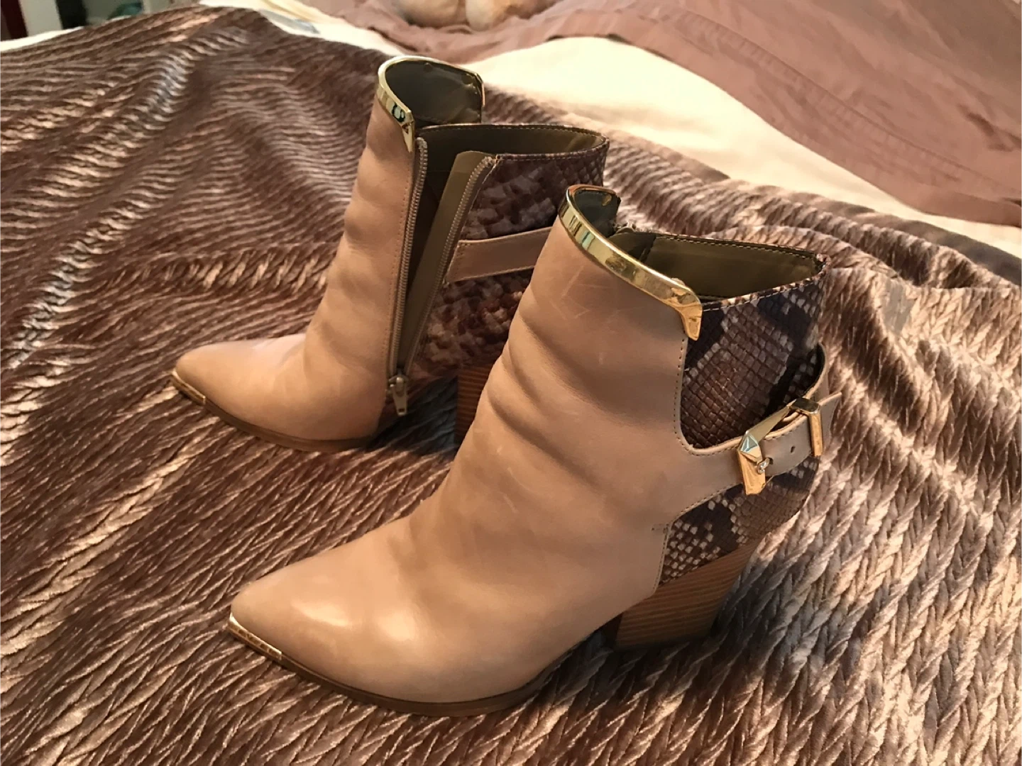 5These stylish size 10 ankle boots feature a beige leather-like material complemented by a snakeskin pattern on the back and heel. They have a comfortable heel height and a side zipper for easy wear. Perfect for adding a touch of flair to any outfit!
