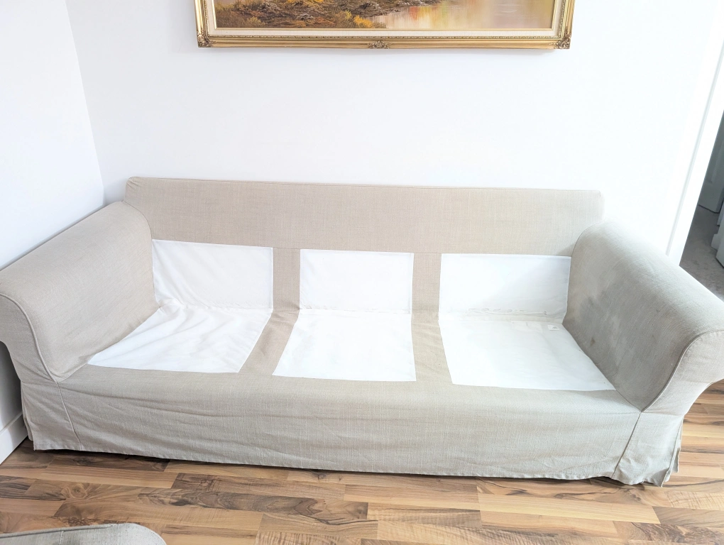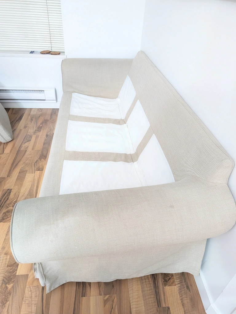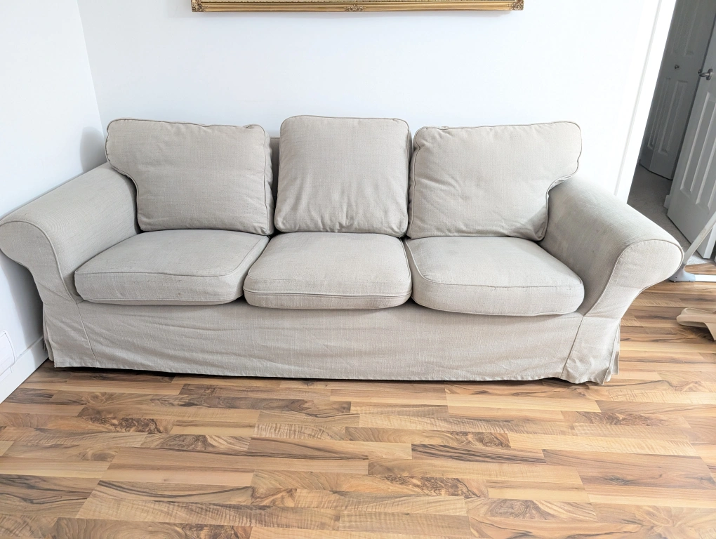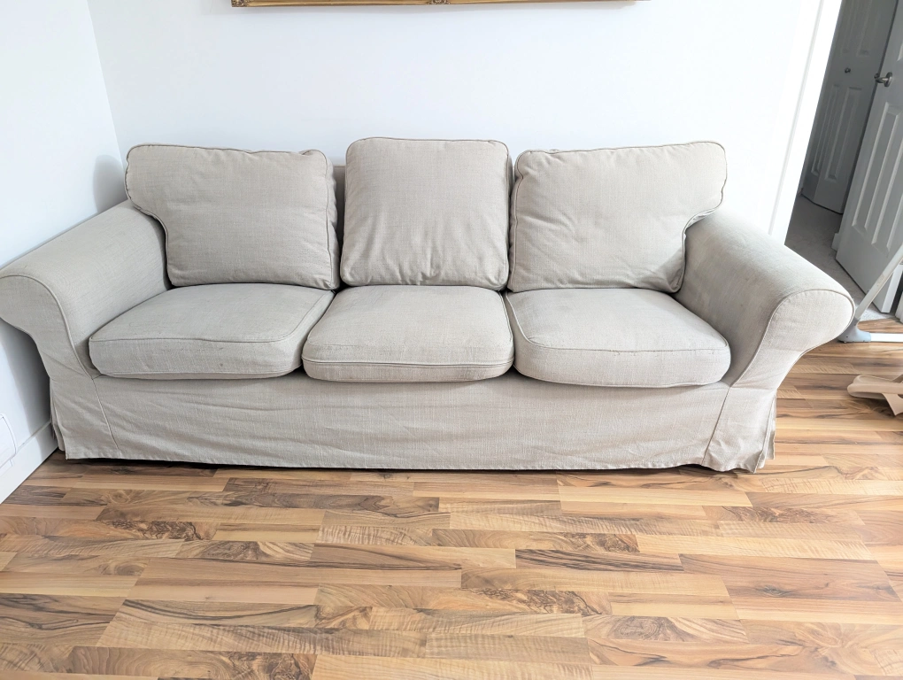 Selling a comfy beige sofa! It comes with a machine washable slipcover, making it easy to clean and maintain. Perfect for a living room or den! From a no pet & non smoking home. pick up at Sapperton.