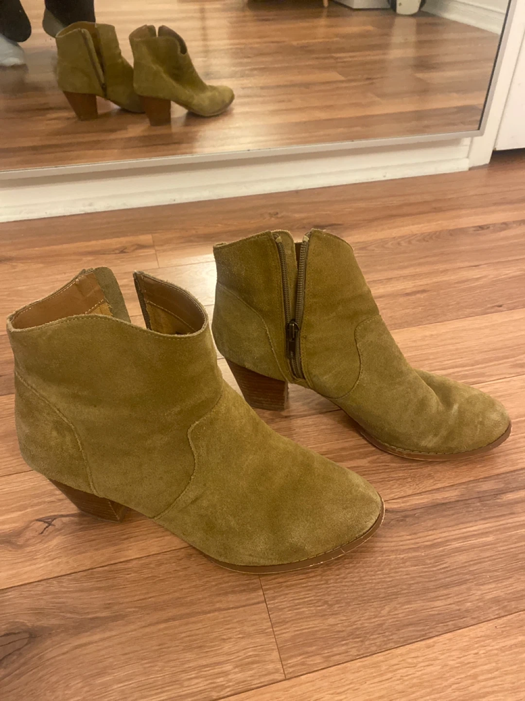 Cute beige-coloured suede ankle boots in a women's size 9. They have a side zipper and a small heel. Perfect for fall! Originally from Urban Outfitters!
