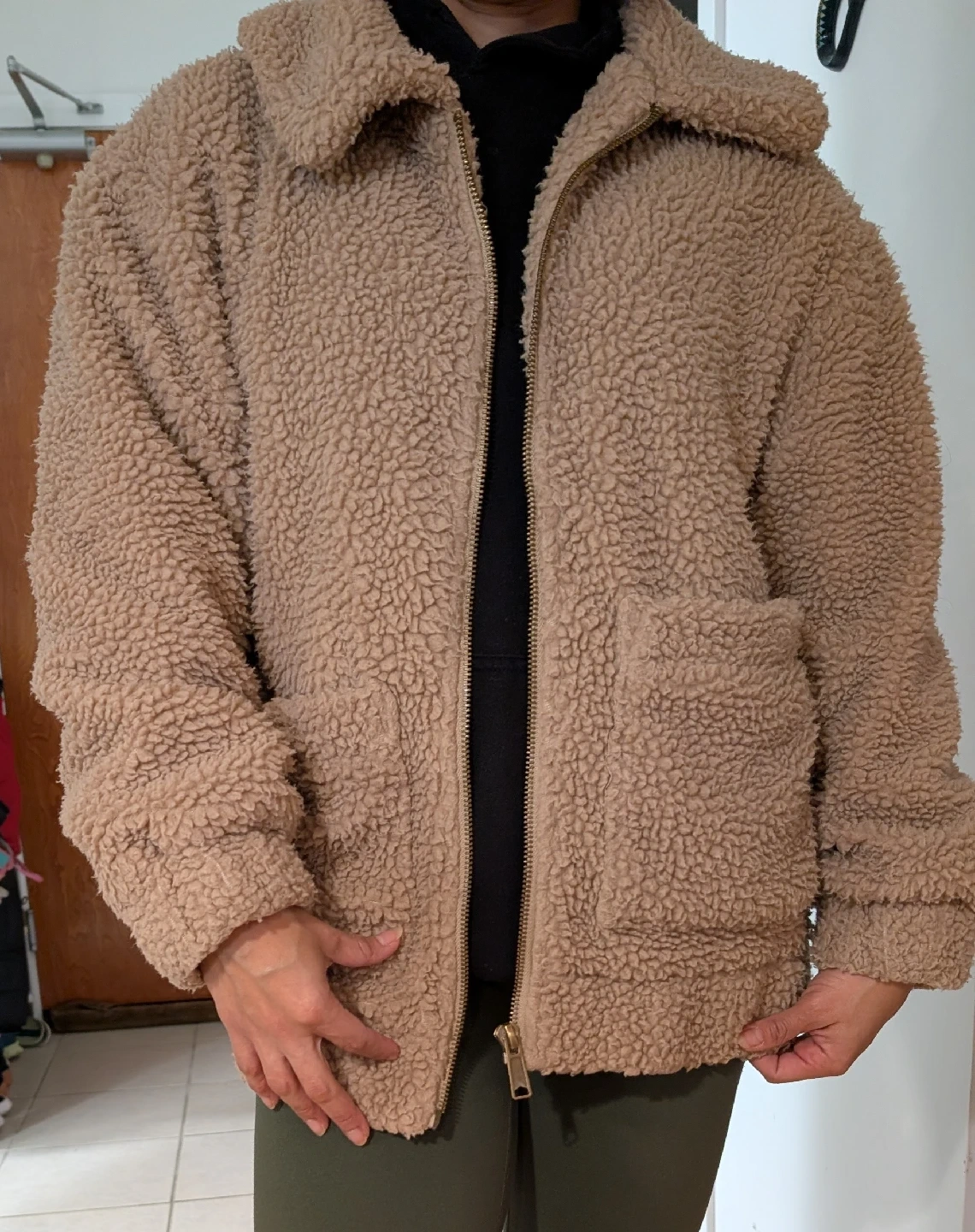 15Selling a cozy beige teddy fleece jacket! It's super soft and warm, perfect for chilly days. The jacket features a zip-up front and handy pockets. Great for layering or wearing on its own!